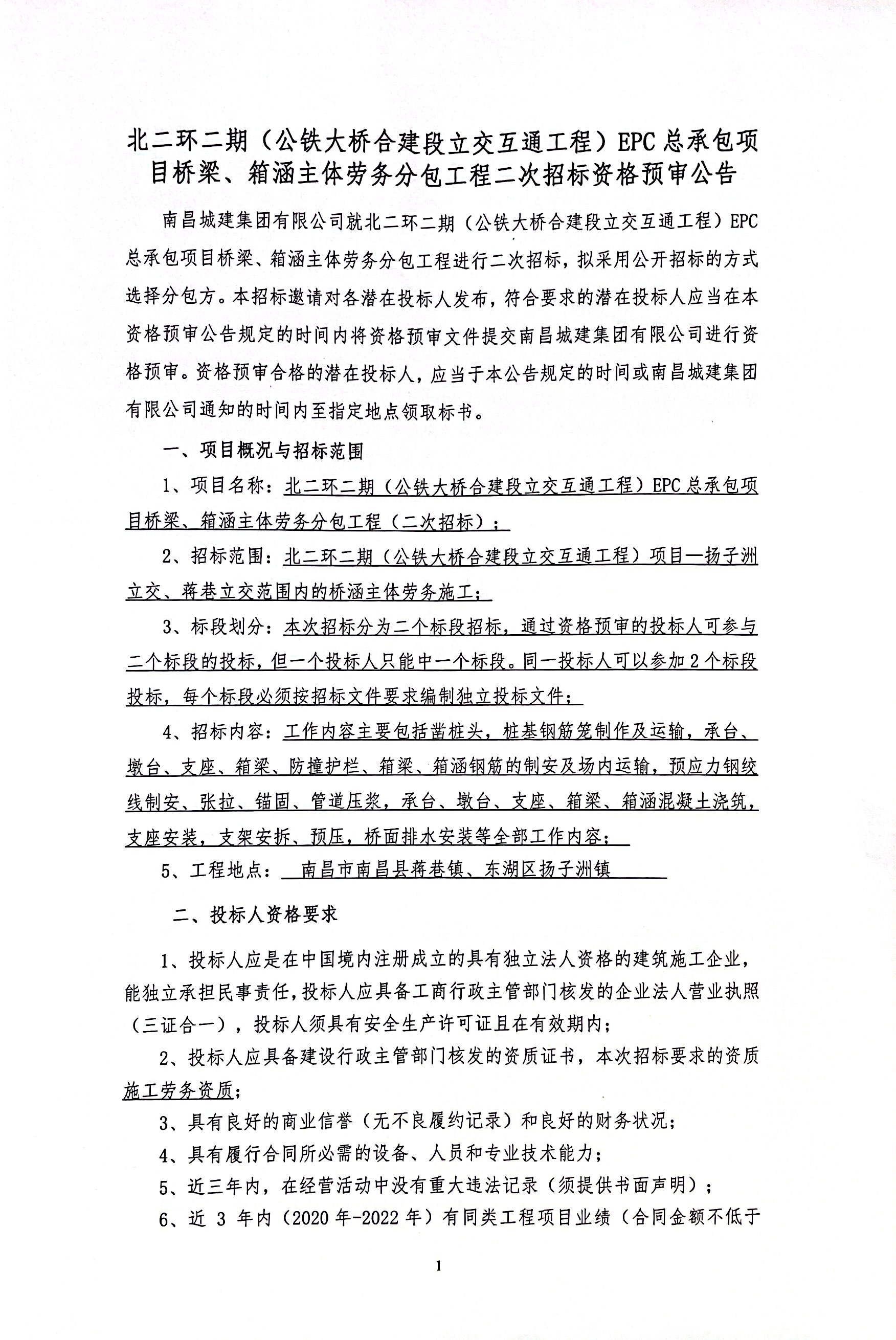 永利yl23411集团有限公司就北二环二期(公铁大桥合建段立交互通工程)EPC总承包项目桥梁、箱涵主体劳务分包工程进行二次招标,拟采用公开招标的方式选择分包方。本招标邀请对各潜在投标人发布,符合要求的潜在投标人应当在本资格预审公告规定的时间内将资格预审文件提交永利yl23411集团有限公司进行资格预审。资格预审合格的潜在投标人,应当于本公告规定的时间或永利yl23411集团有限公司通知的时间内至指定地点领取标书。