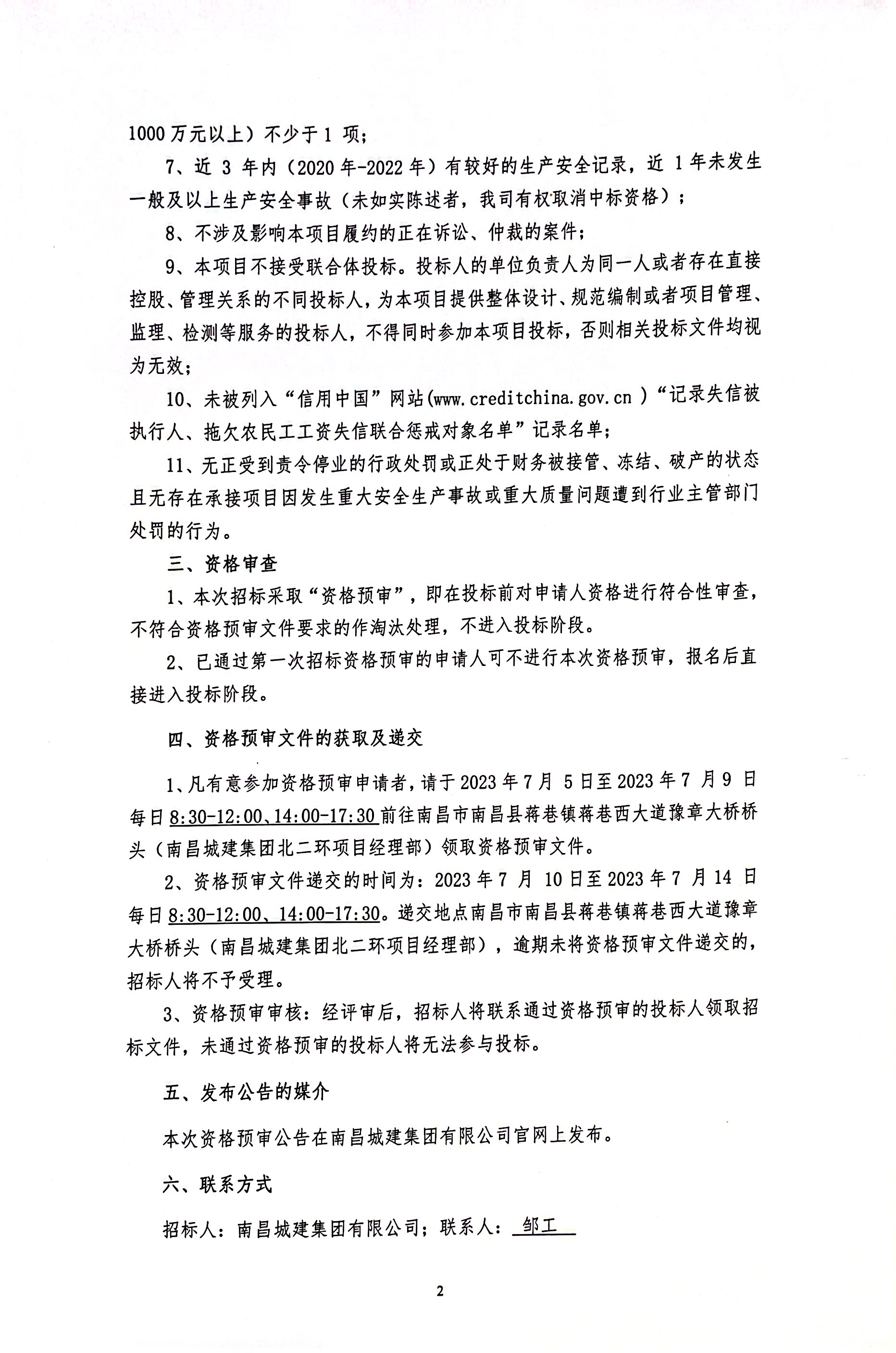 2、资格预审文件递交的时间为:2023年7 月 10日至2023年7 月14 日每日8:30-12:00、14:00-17:30。递交地点南昌市南昌县蒋巷镇蒋巷西大道豫章大桥桥头(永利yl23411集团北二环项目经理部),逾期未将资格预审文件递交的,招标人将不予受理。