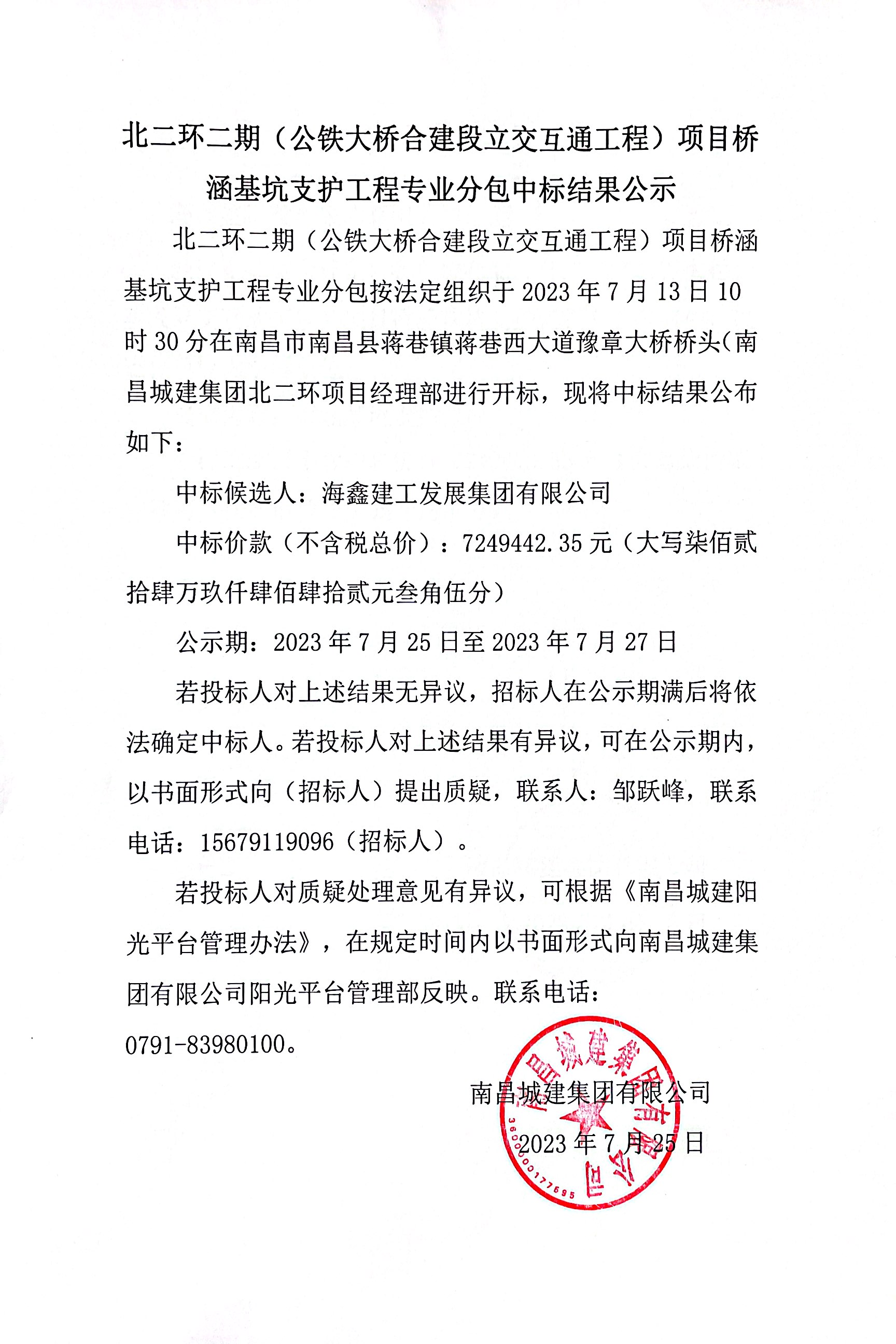 北二环二期(公铁大桥合建段立交互通工程)项目桥涵基坑支护工程专业分包按法定组织于2023年7月13日10时30分在南昌市南昌县蒋巷镇蒋巷西大道豫章大桥桥头(永利yl23411集团北二环项目经理部进行开标,现将中标结果公布如下: