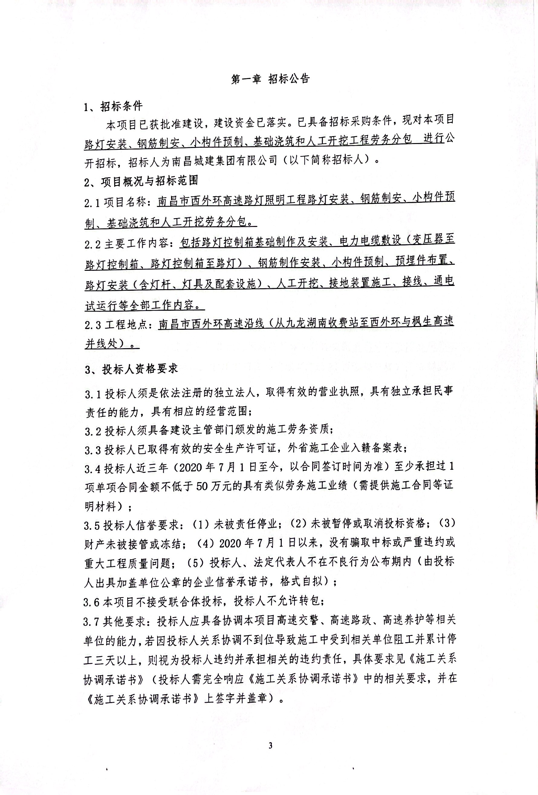 2.1项目名称:南昌市西外环高速路灯照明工程路灯安装、钢筋制安、小构件预制、基础浇筑和人工开挖劳务分包。