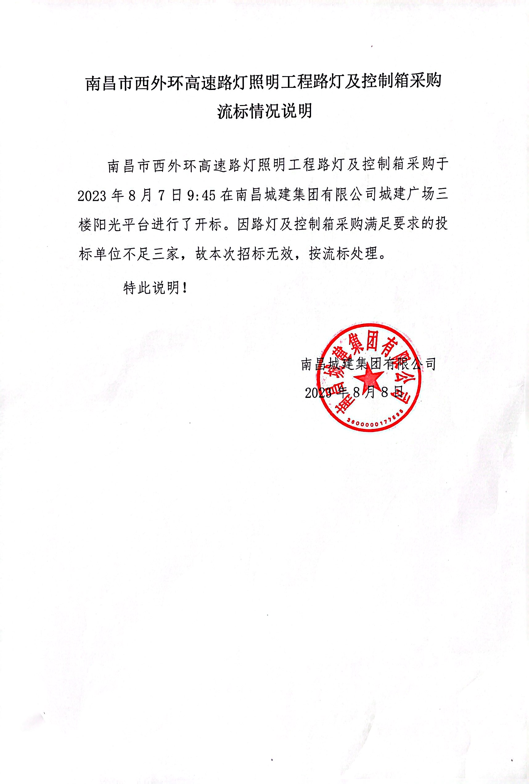 南昌市西外环高速路灯照明工程路灯及控制箱采购于2023年8月7日9:45在永利yl23411集团有限公司城建广场三楼阳光平台进行了开标。因路灯及控制箱采购满足要求的投标单位不足三家,故本次招标无效,按流标处理。