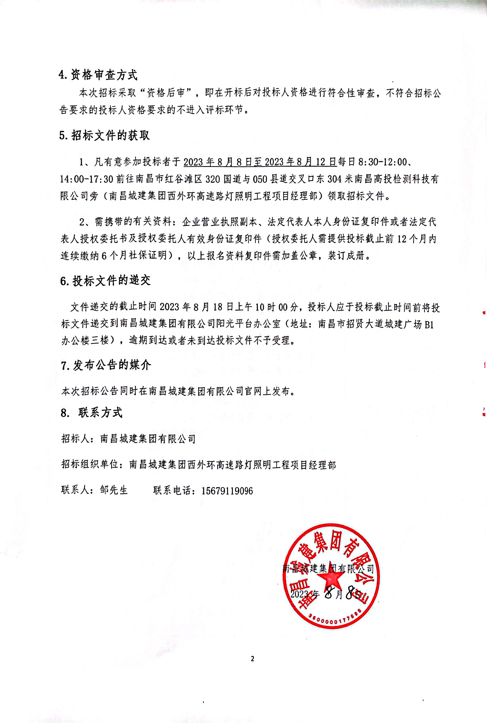 1、凡有意参加投标者于2023年8月8日至2023年8月12日每日8:30-12:00、14:00-17:30前往南昌市红谷滩区320国道与050县道交叉口东304米南昌高投检测科技有限公司旁(永利yl23411集团西外环高速路灯照明工程项目经理部)领取招标文件。