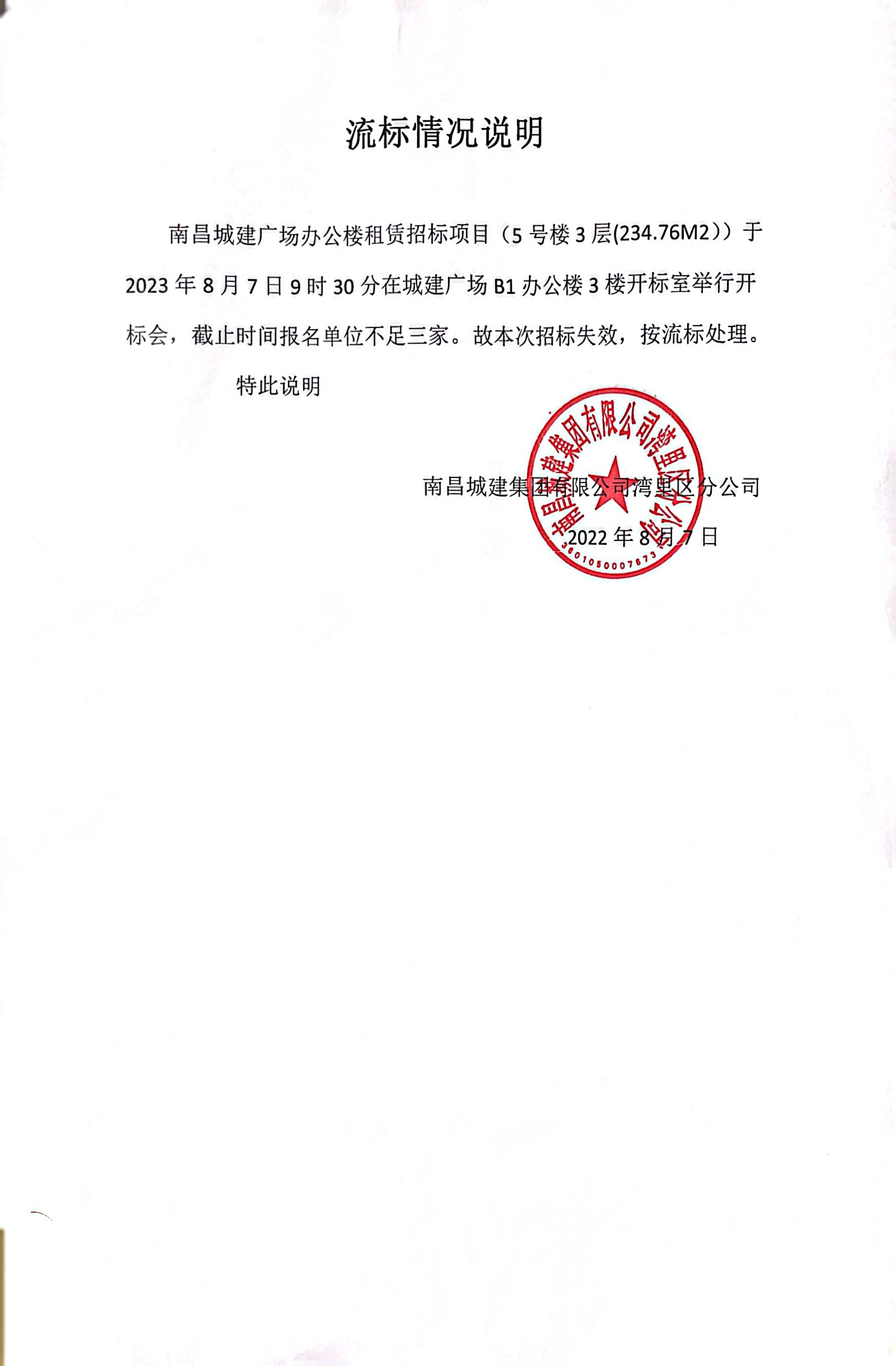 永利yl23411广场办公楼租赁招标项目(5号楼3层(234.76㎡))于2023年8月7日9时30分在城建广场B1办公楼3楼开标室举行开标会,截止时间报名单位不足三家。故本次招标失效,按流标处理。