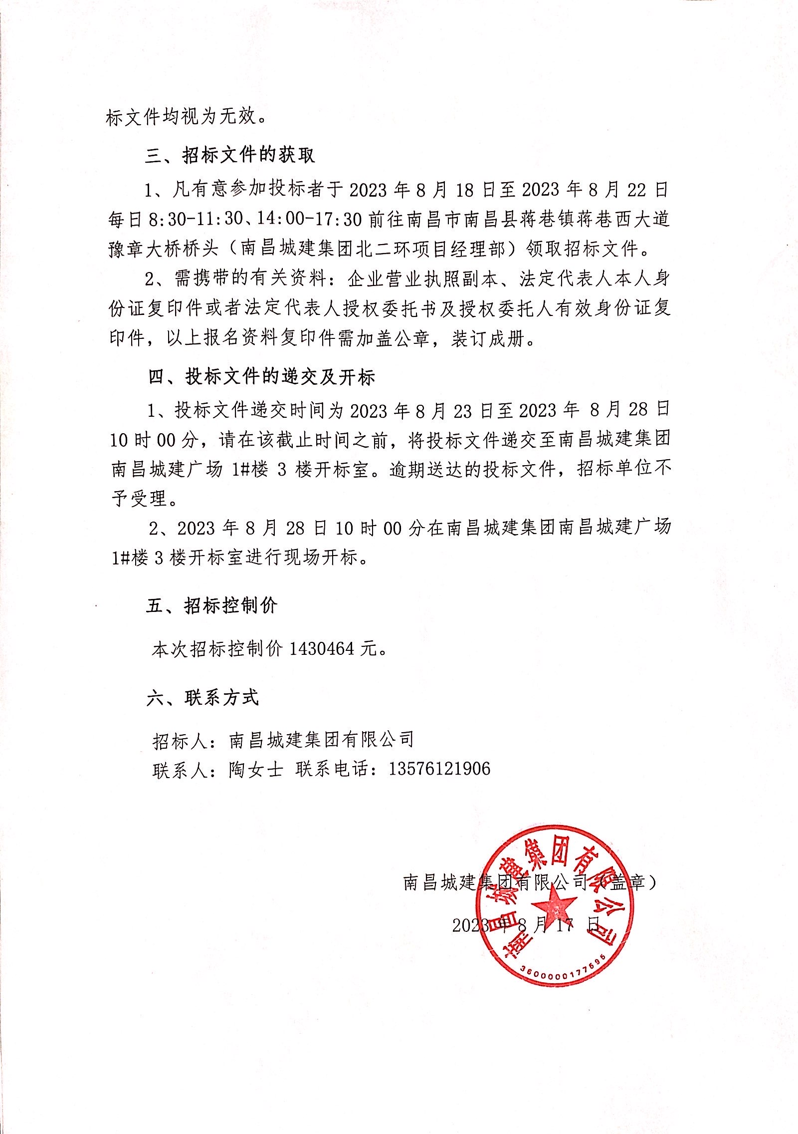 1、凡有意参加投标者于2023年8月18日至2023年8月22日每日8:30-11:30、14:00-17:30前往南昌市南昌县蒋巷镇蒋巷西大道豫章大桥桥头(永利yl23411集团北二环项目经理部)领取招标文件。