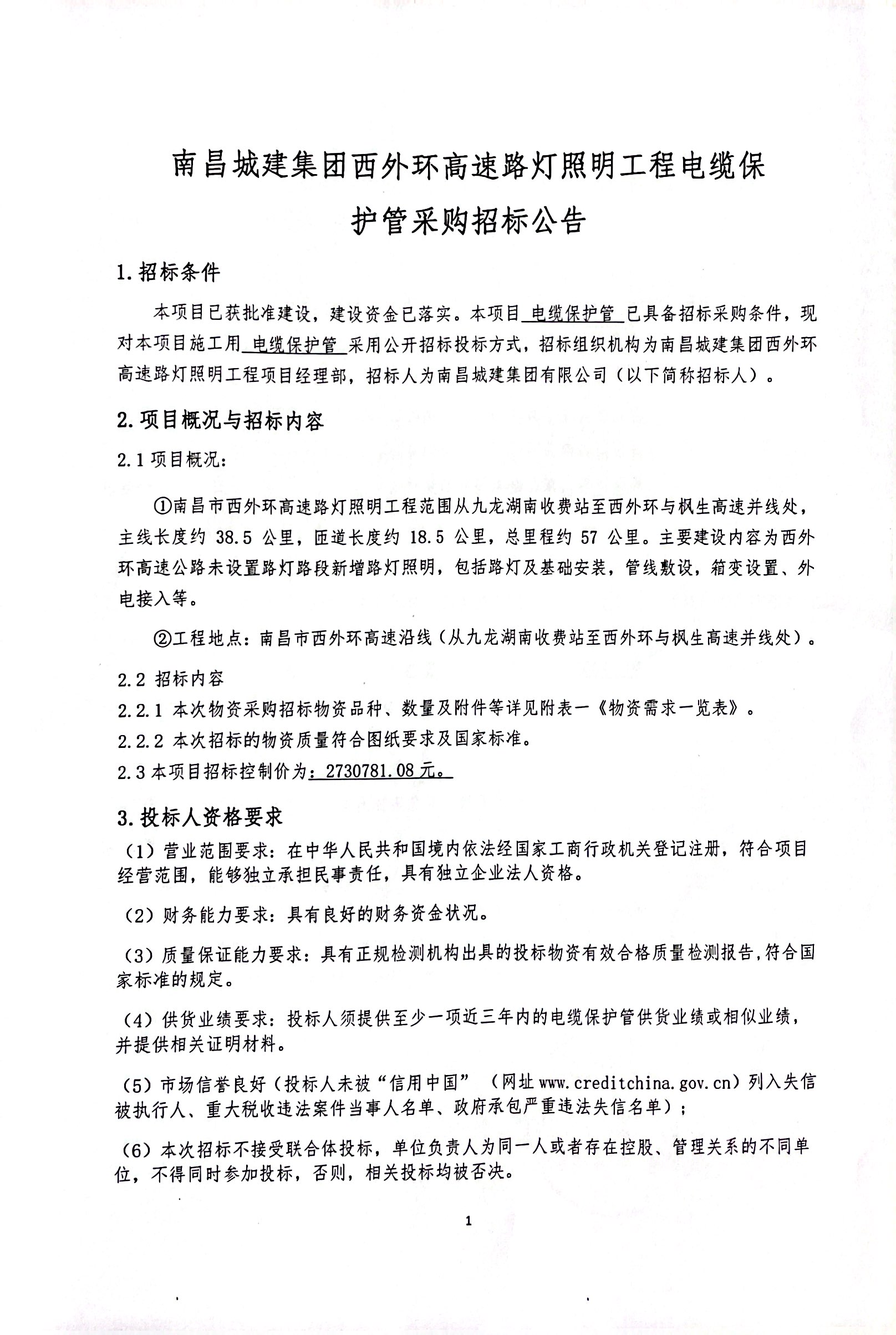 本项目已获批准建设,建设资金已落实。本项目 电缆保护管 已具备招标采购条件,现对本项目施工用 电缆保护管 采用公开招标投标方式,招标组织机构为永利yl23411集团西外环高速路灯照明工程项目经理部,招标人为永利yl23411集团有限公司(以下简称招标人)。
