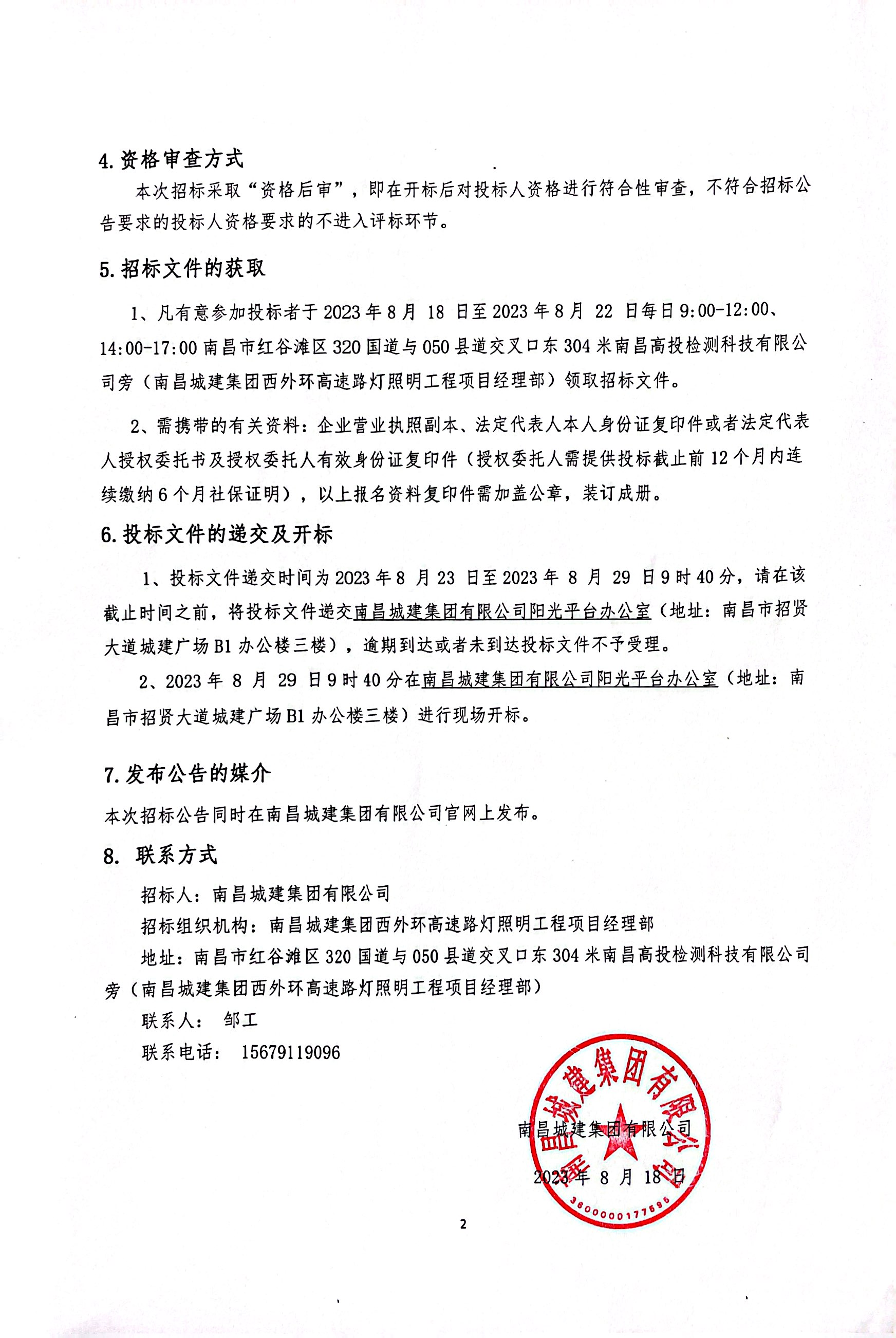 1、凡有意参加投标者于2023年8月 18 日至2023年8月 22 日每日9:00-12:00、14:00-17:00南昌市红谷滩区320国道与050县道交叉口东304米南昌高投检测科技有限公司旁(永利yl23411集团西外环高速路灯照明工程项目经理部)领取招标文件。