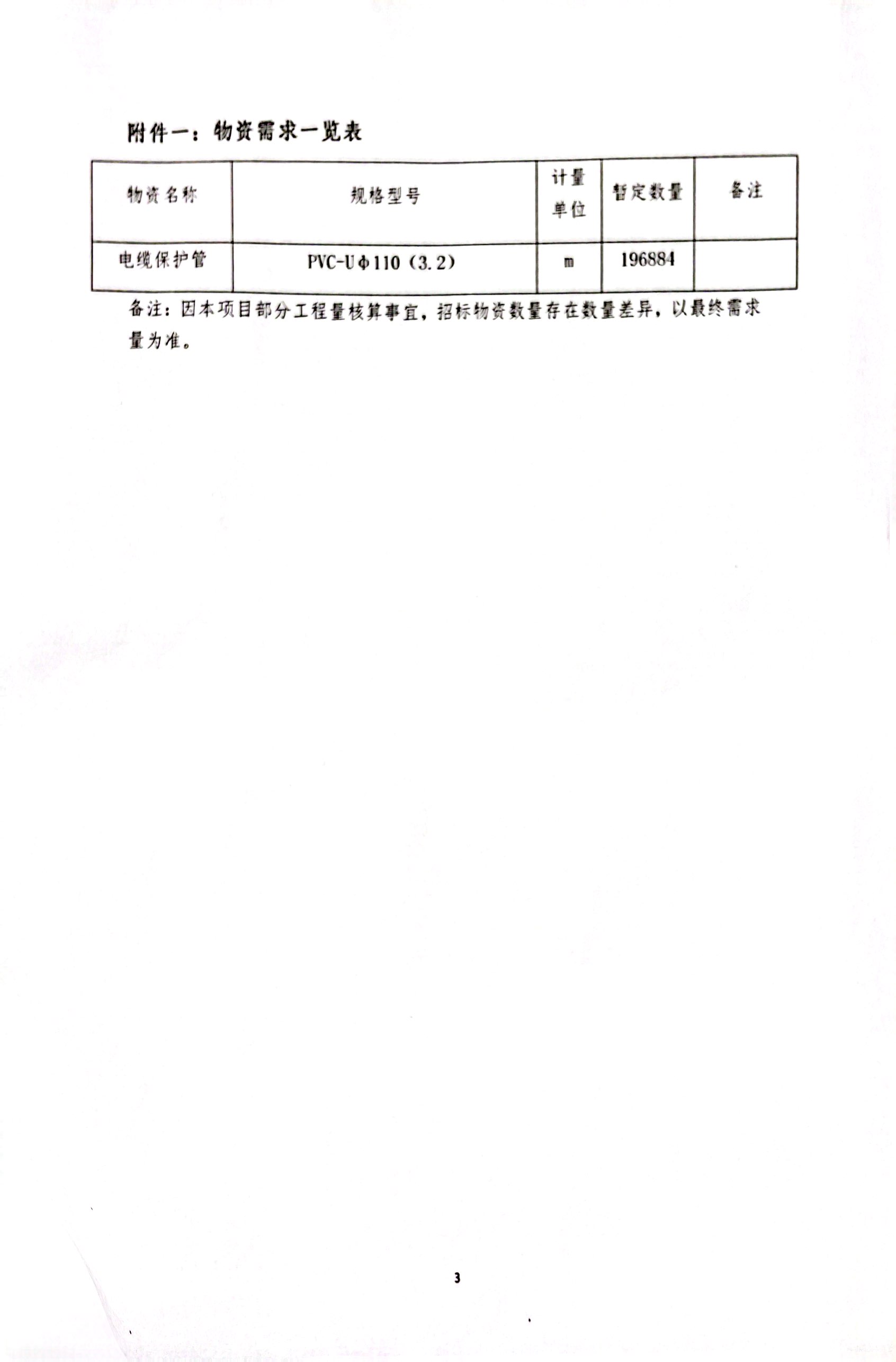 备注:因本项目部分工程量核算事宜,招标物资数量存在数量差异,以最终需求量为准。