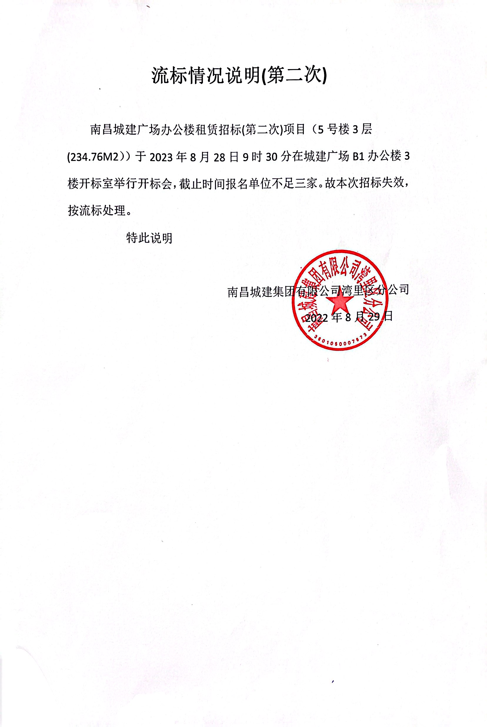 永利yl23411广场办公楼租赁招标(第二次)项目(5号楼3层(234.76M2))于2023年8月28日9时30分在城建广场B1办公楼3楼开标室举行开标会,截止时间报名单位不足三家。故本次招标失效,按流标处理。