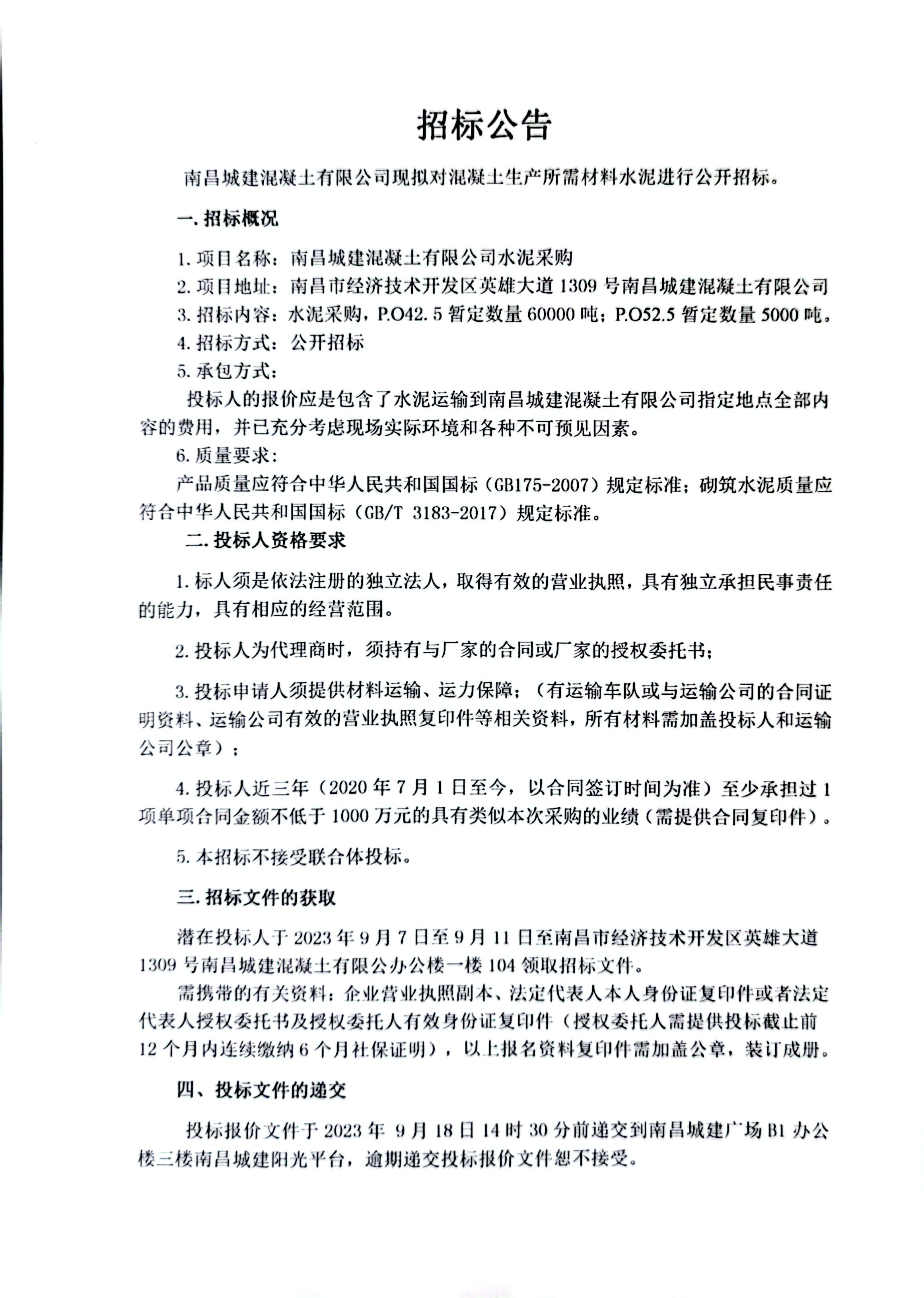 永利yl23411混凝土有限公司现拟对混凝土生产所需材料水泥进行公开招标。