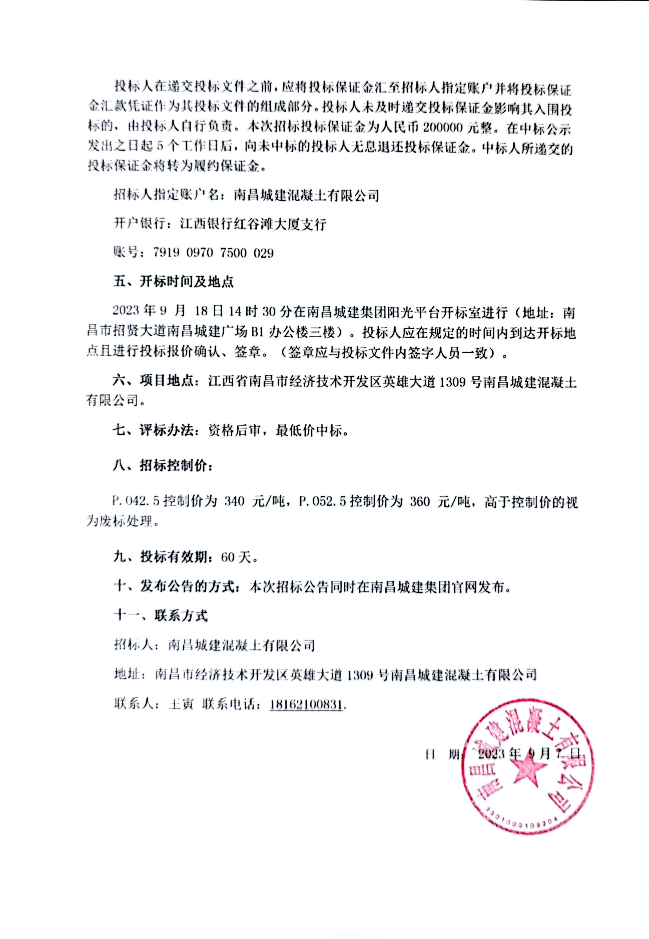 2023年9 月 18日14时30分在永利yl23411集团阳光平台开标室进行(地址:南昌市招贤大道永利yl23411广场B1办公楼三楼)。投标人应在规定的时间内到达开标地点且进行投标报价确认、签章。(签章应与投标文件内签字人员一致)。