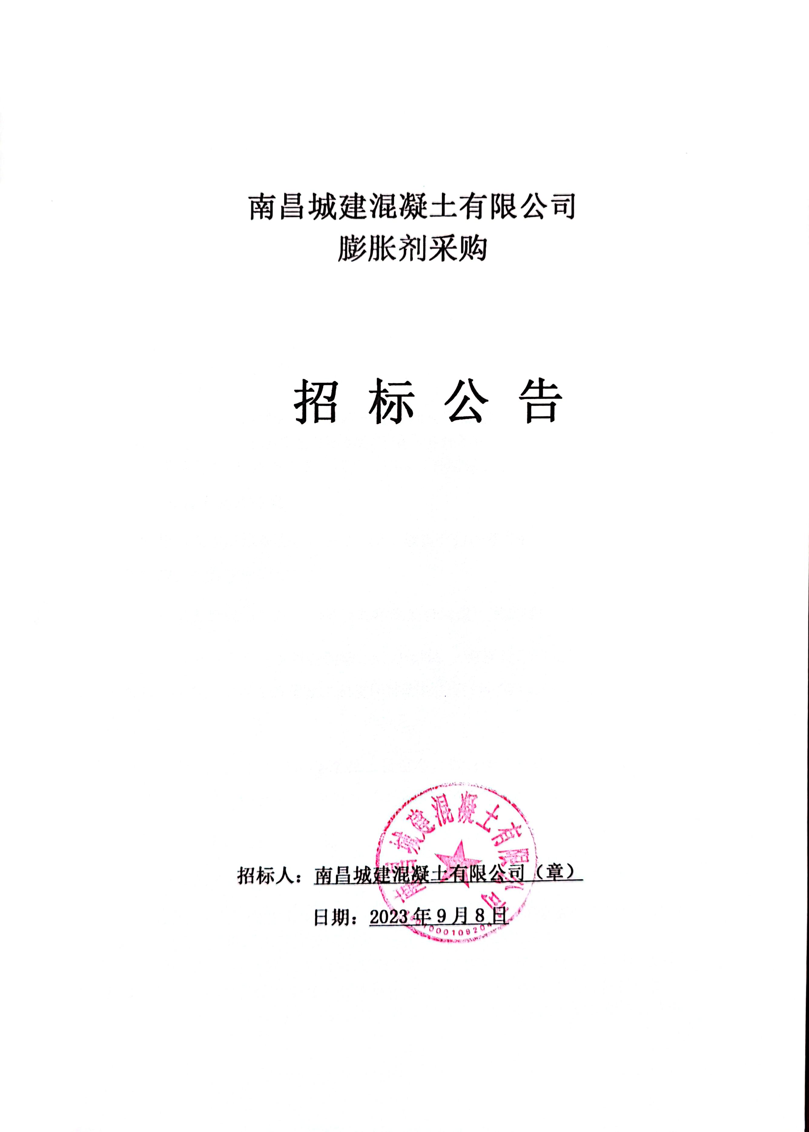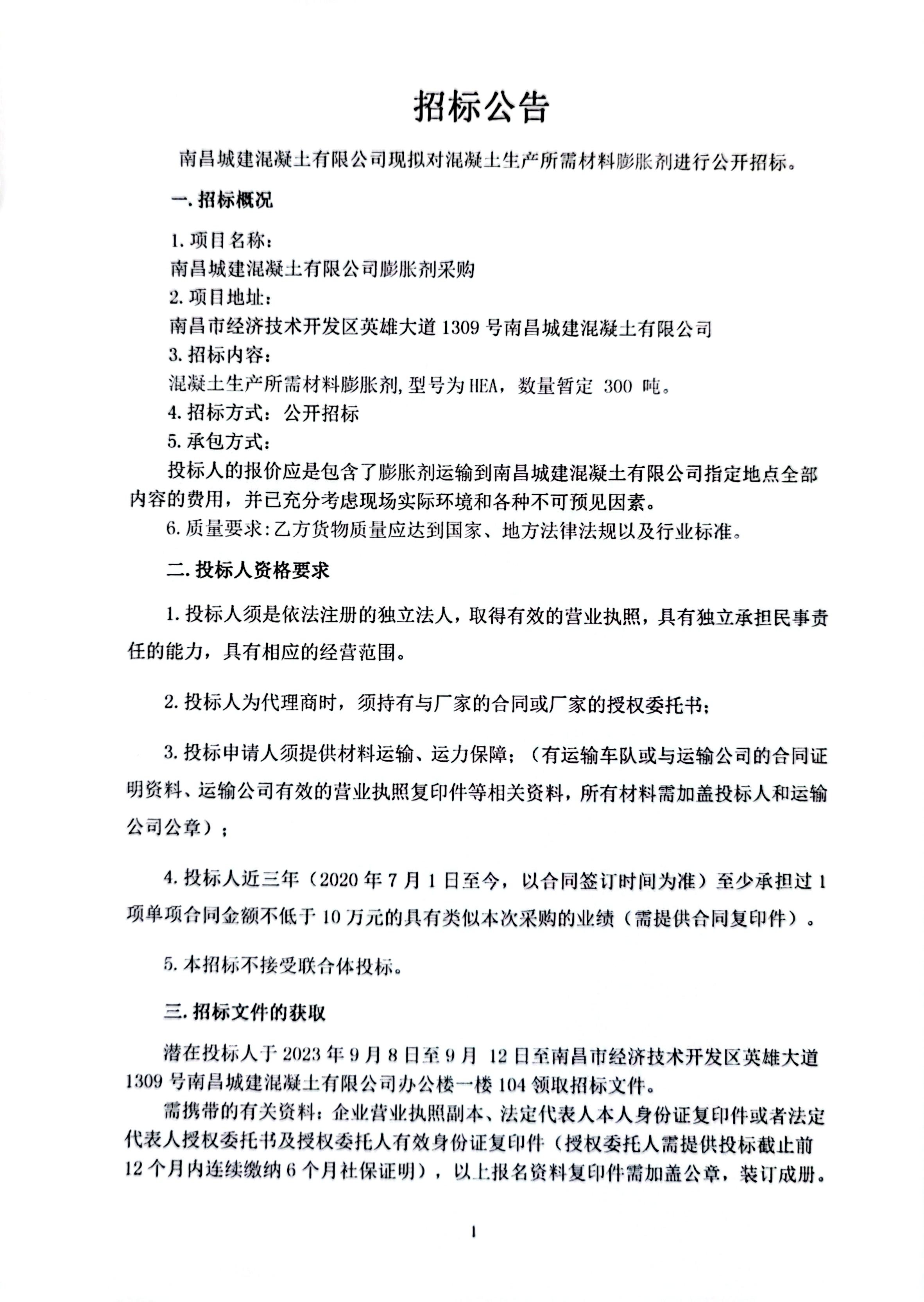 永利yl23411混凝土有限公司现拟对混凝土生产所需材料膨胀剂进行公开招标。