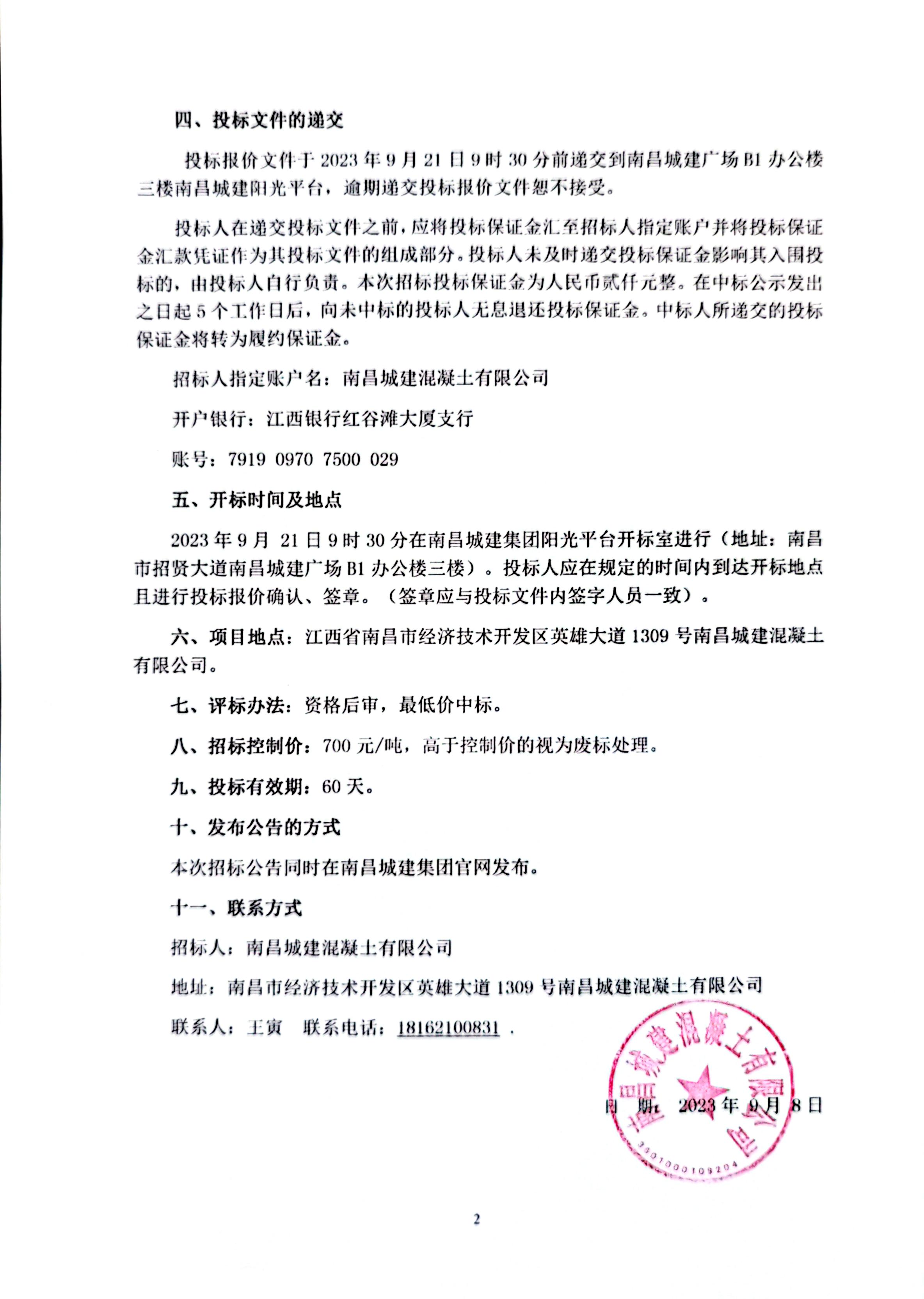 2023年9月 21日9时30分在永利yl23411集团阳光平台开标室进行(地址:南昌市招贤大道永利yl23411广场B1办公楼三楼)。投标人应在规定的时间内到达开标地点且进行投标报价确认、签章。(签章应与投标文件内签字人员一致)。