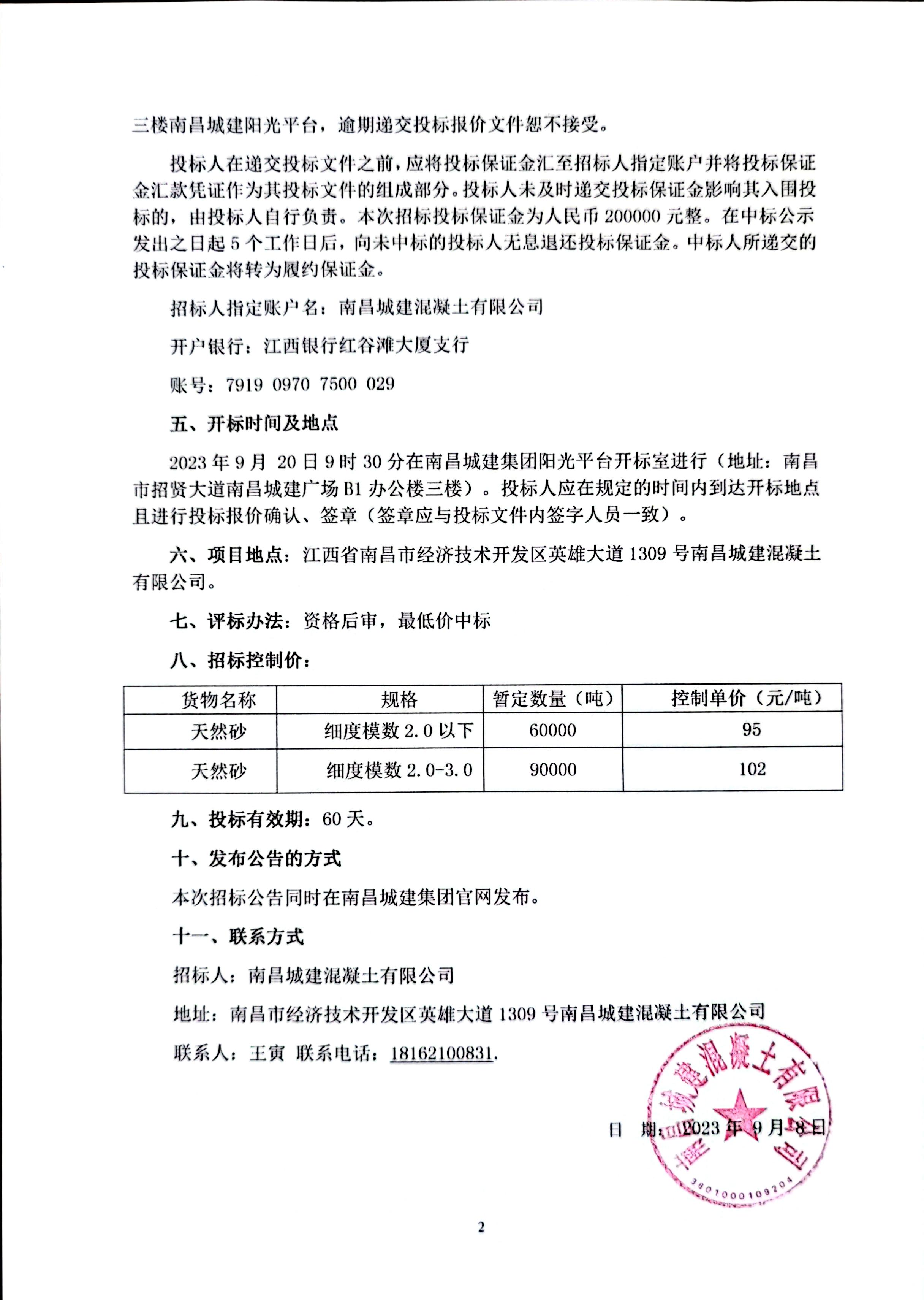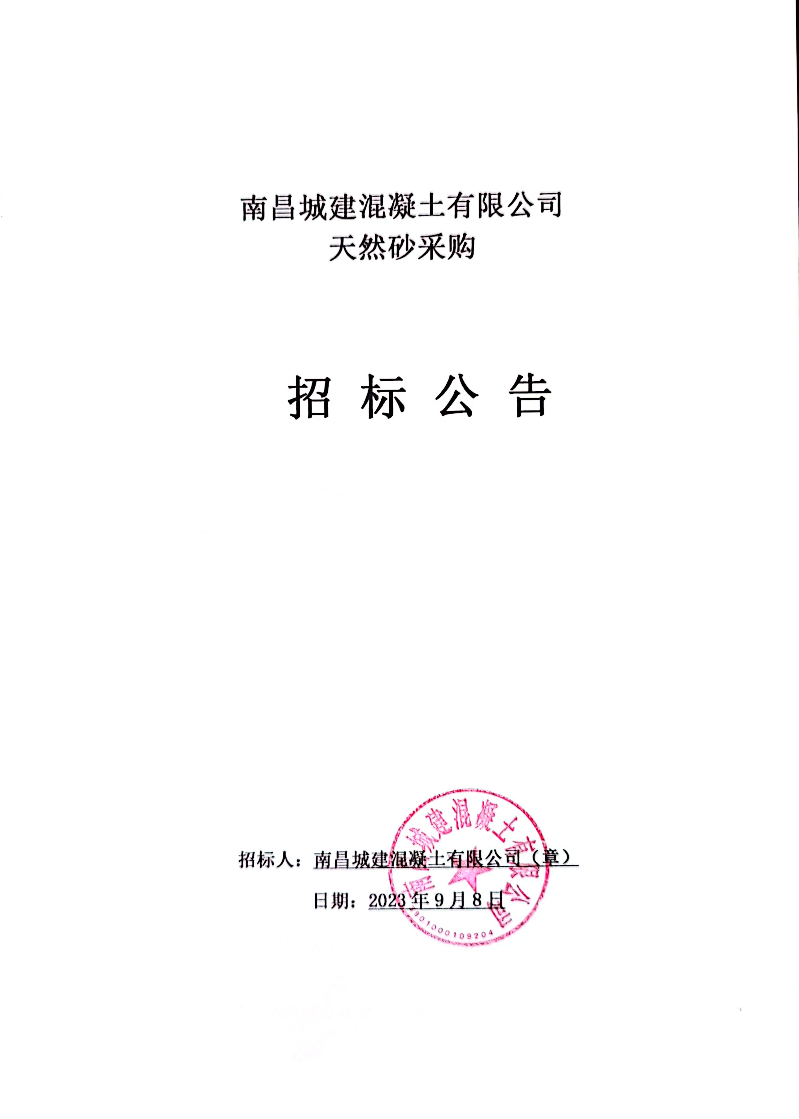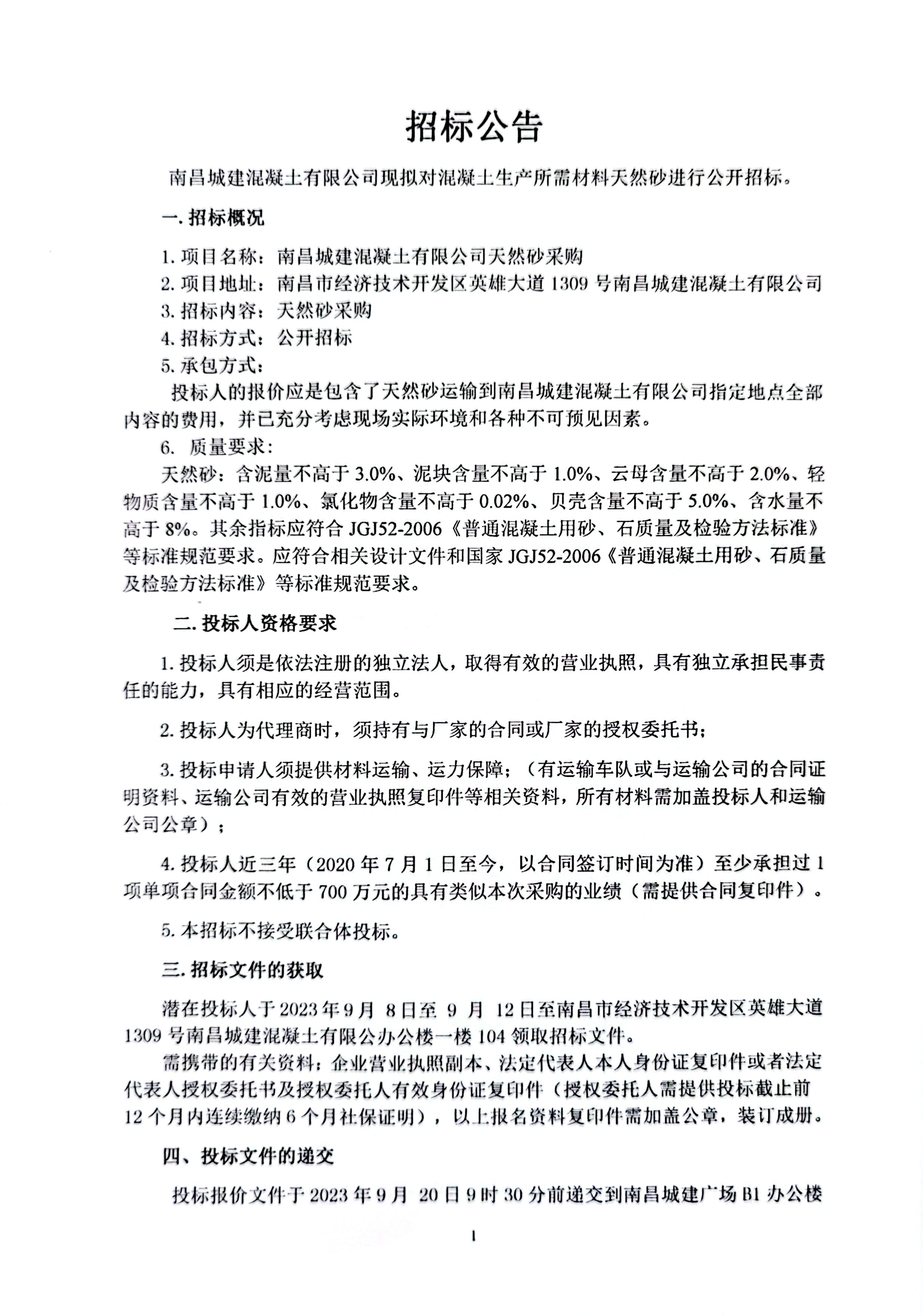 永利yl23411混凝土有限公司现拟对混凝土生产所需材料天然砂进行公开招标。