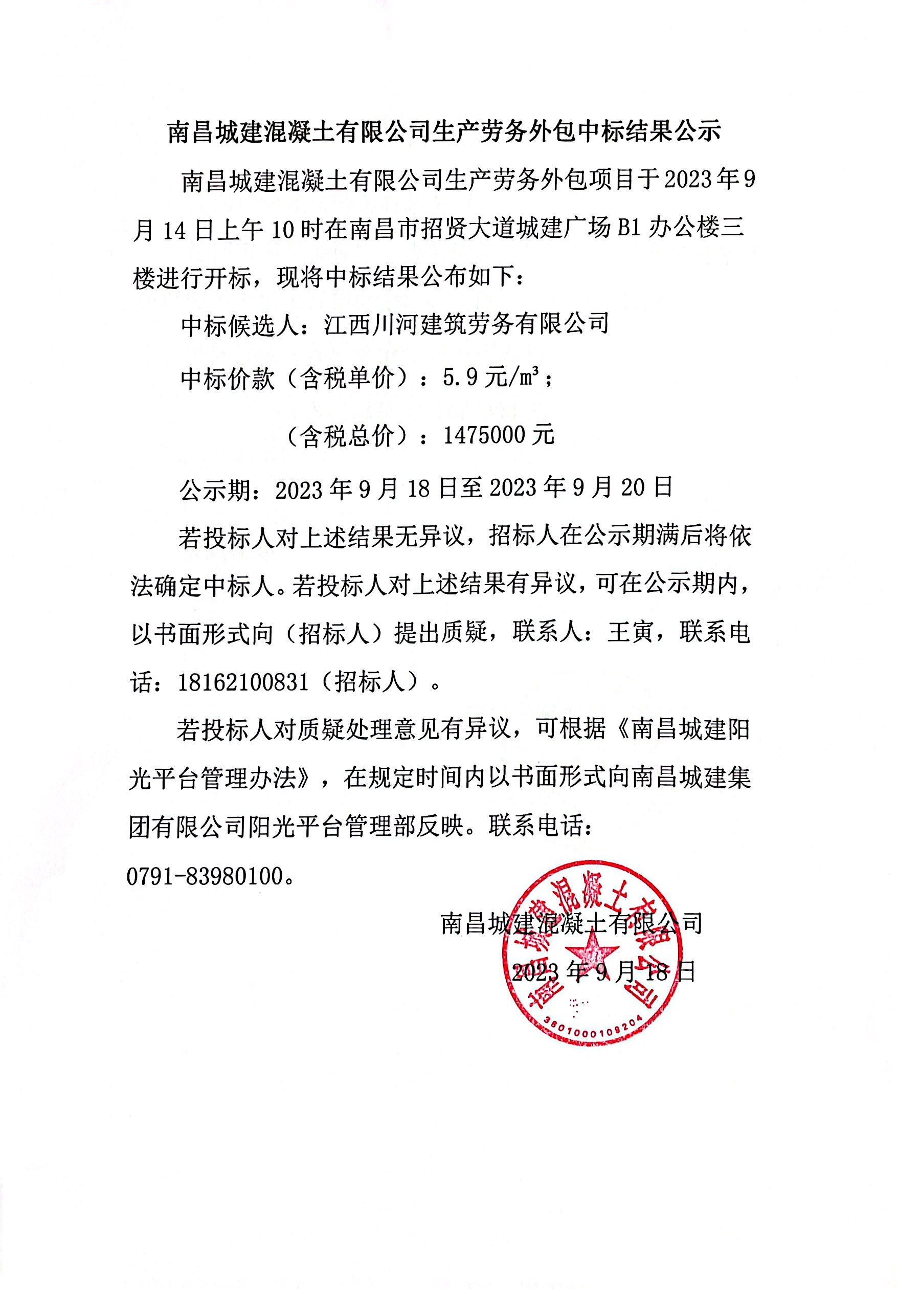 永利yl23411混凝土有限公司生产劳务外包项目于2023年9月14日上午10时在南昌市招贤大道城建广场B1办公楼三楼进行开标,现将中标结果公布如下: