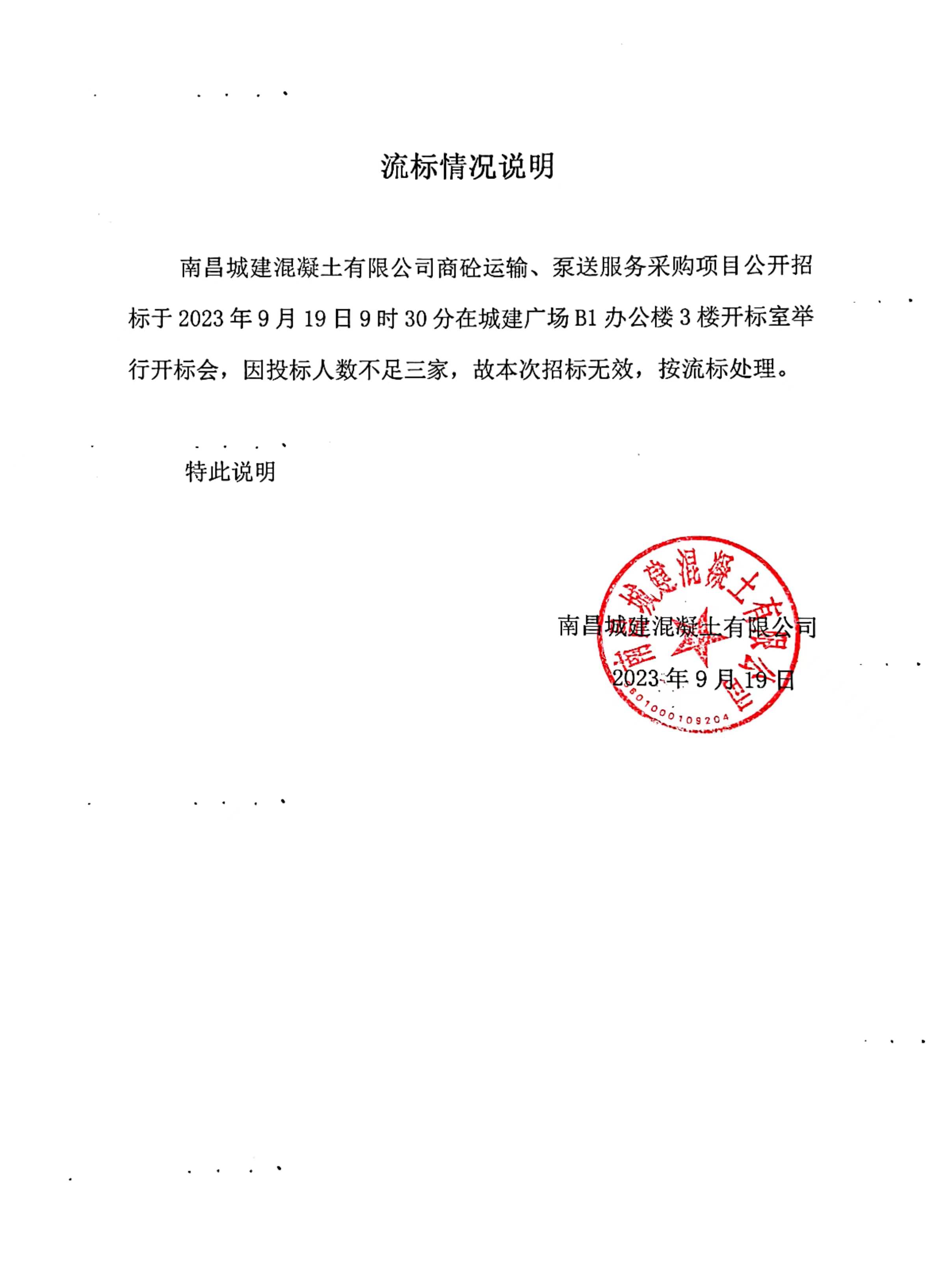 永利yl23411混凝土有限公司商砼运输、泵送服务采购项目公开招标于2023年9月19日9时30分在城建广场B1办公楼3楼开标室举行开标会,因投标人数不足三家,故本次招标无效,按流标处理。