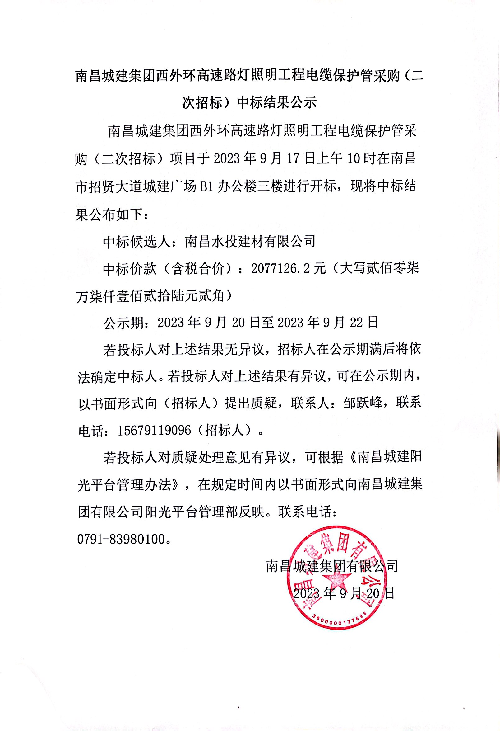 永利yl23411集团西外环高速路灯照明工程电缆保护管采购(二次招标)项目于2023年9月17日上午10时在南昌市招贤大道城建广场B1办公楼三楼进行开标,现将中标结果公布如下: