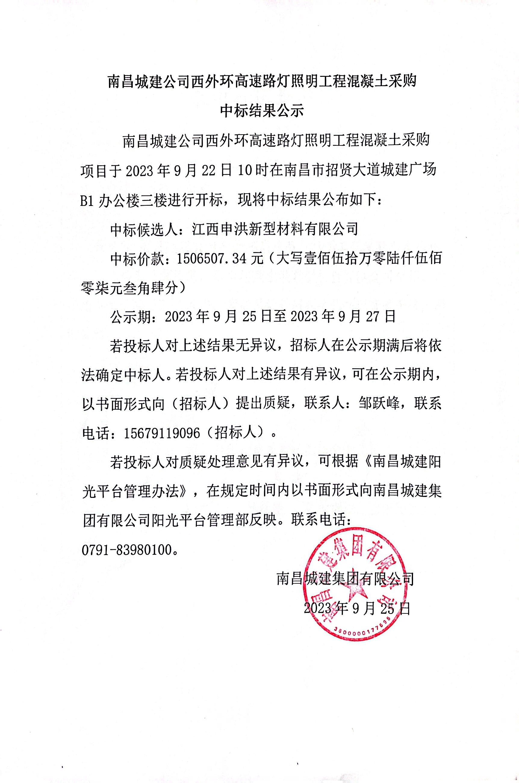永利yl23411公司西外环高速路灯照明工程混凝土采购项目于2023年9月22日10时在南昌市招贤大道城建广场B1办公楼三楼进行开标,现将中标结果公布如下: