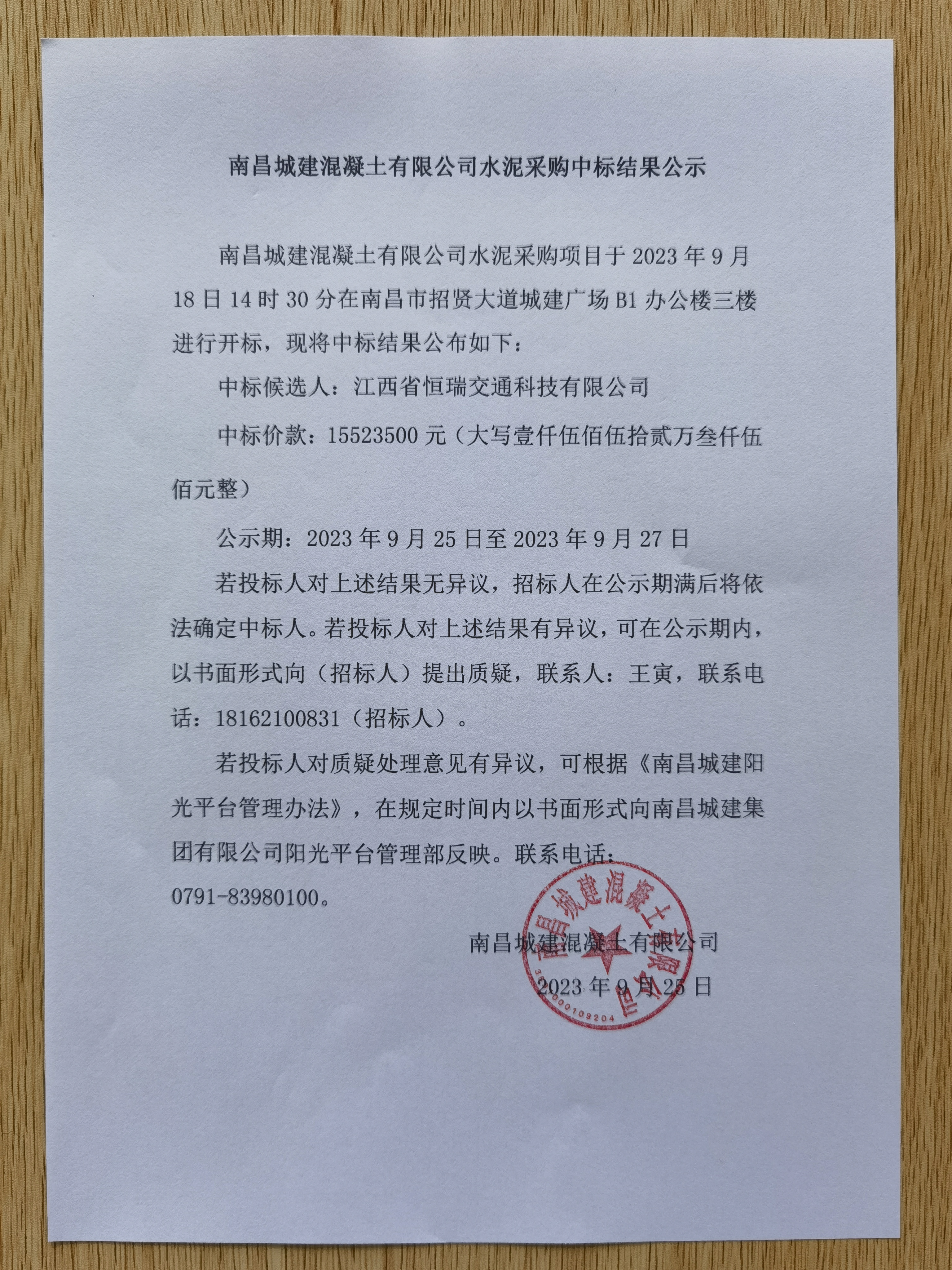 永利yl23411混凝土有限公司水泥采购项目于2023年9月18日14时30分在南昌市招贤大道城建广场B1办公楼三楼进行开标,现将中标结果公布如下: