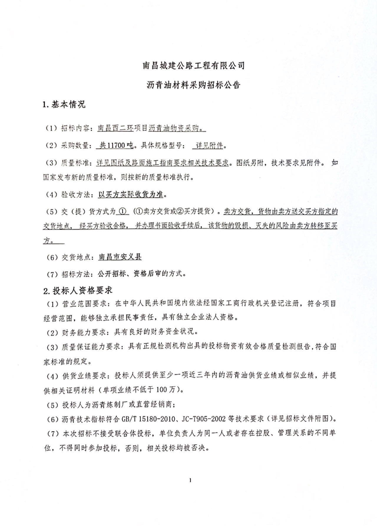 (1)招标内容:南昌西二环项目沥青油物资采购。