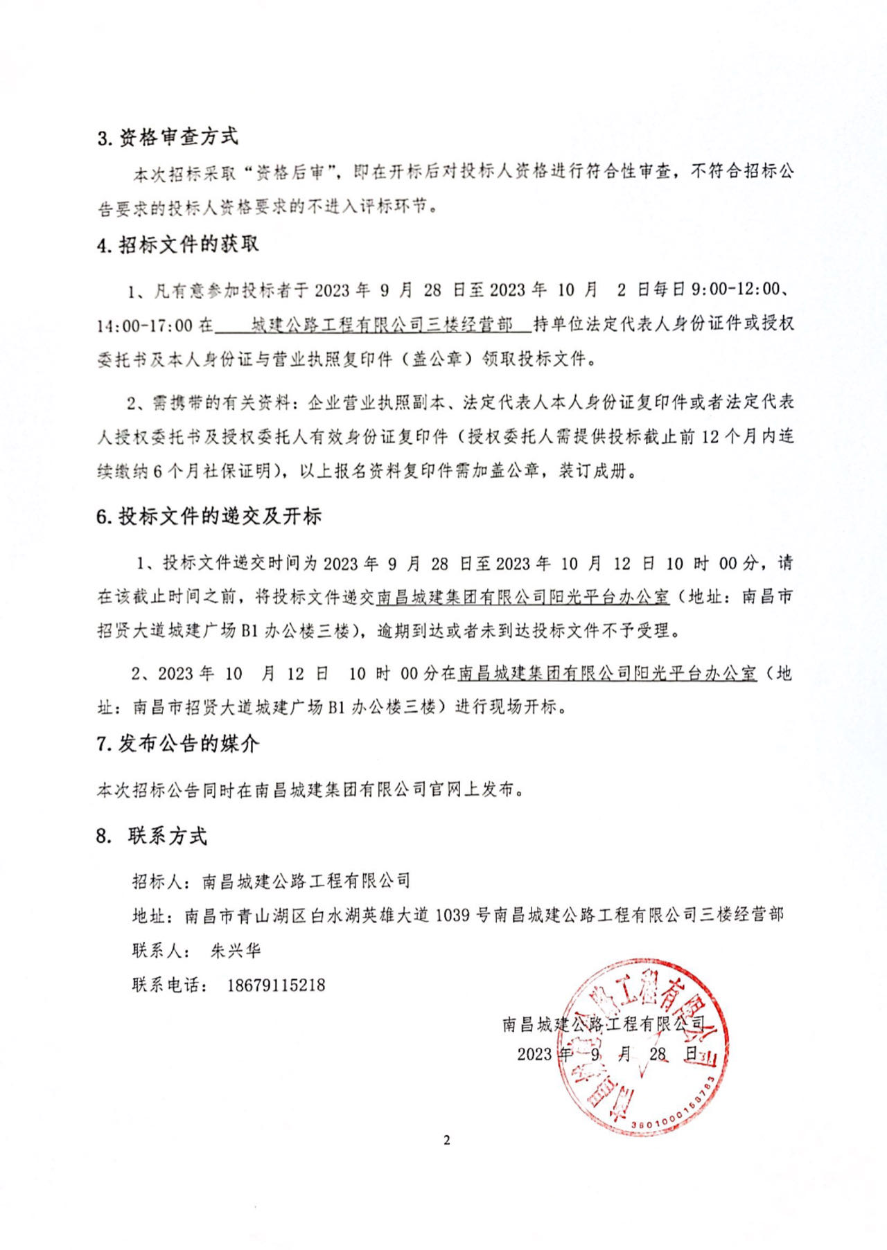 1、凡有意参加投标者于2023年 9 月 28 日至2023年 10 月 2 日每日9:00-12:00、14:00-17:00在 城建公路工程有限公司三楼经营部 持单位法定代表人身份证件或授权委托书及本人身份证与营业执照复印件(盖公章)领取投标文件。