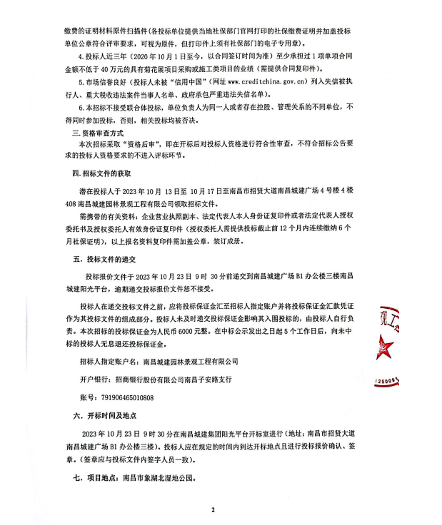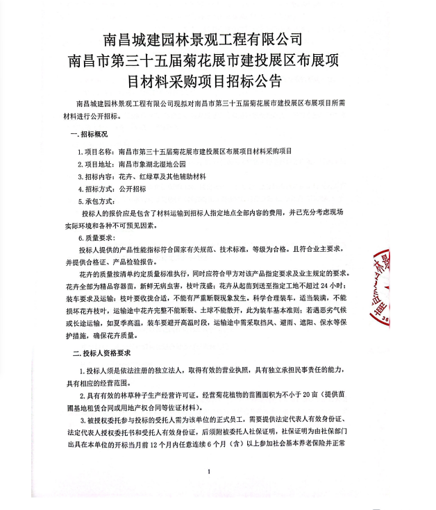 永利yl23411园林景观工程有限公司现拟对南昌市第三十五届菊花展市建投展区布展项目所需材料进行公开招标。