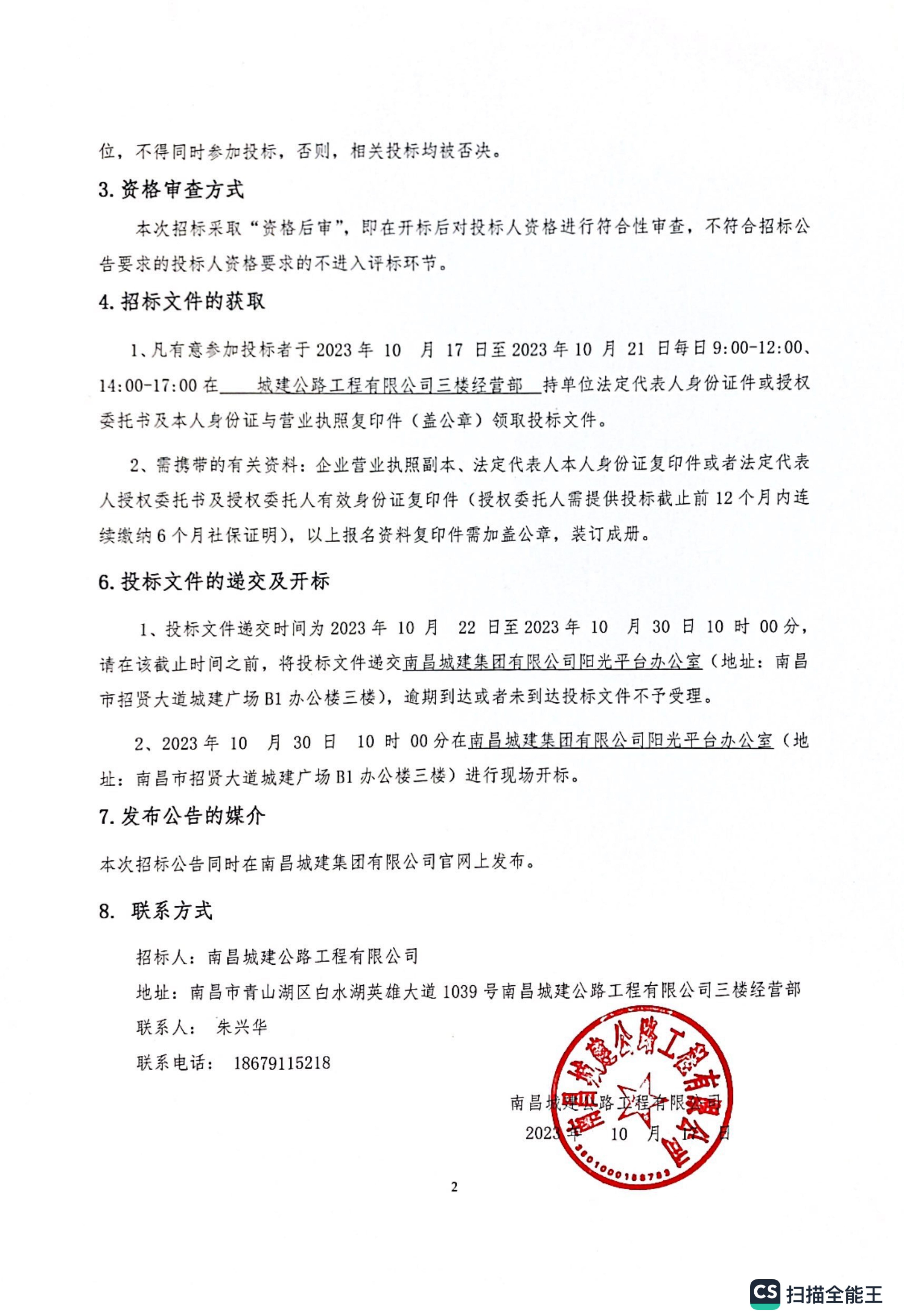 1、凡有意参加投标者于2023年 10 月 17 日至2023年10 月 21 日每日9:00-12:00、14:00-17:00在 城建公路工程有限公司三楼经营部 持单位法定代表人身份证件或授权委托书及本人身份证与营业执照复印件(盖公章)领取投标文件。
