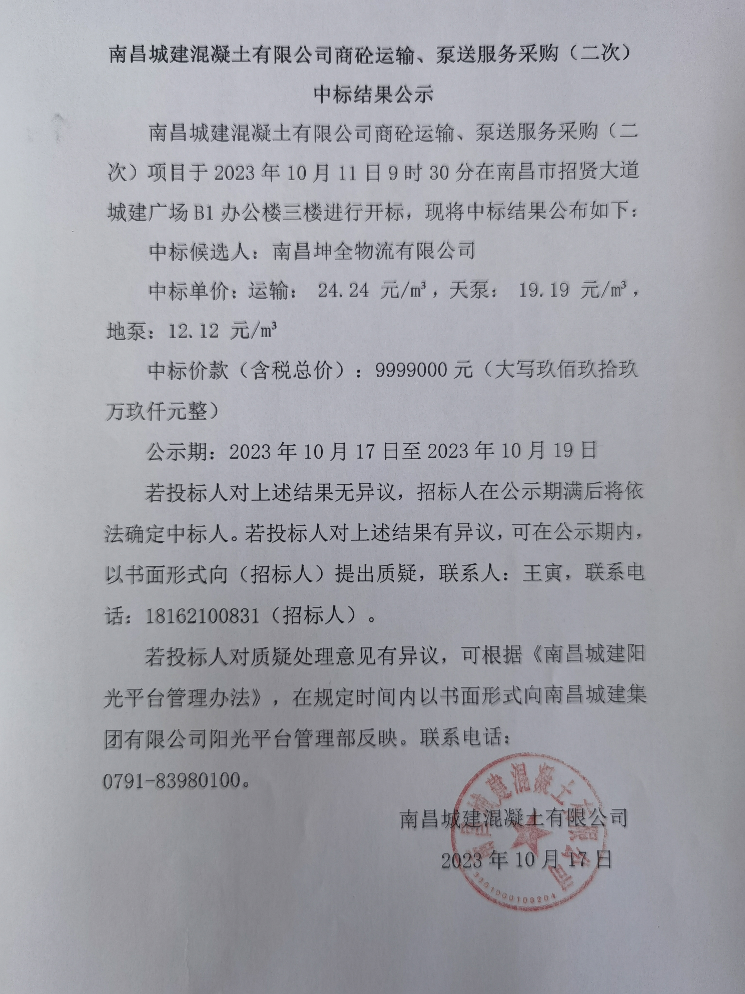 永利yl23411混凝土有限公司商砼运输、泵送服务采购(二次)项目于2023年10月11日9时30分在南昌市招贤大道城建广场B1办公楼三楼进行开标,现将中标结果公布如下: