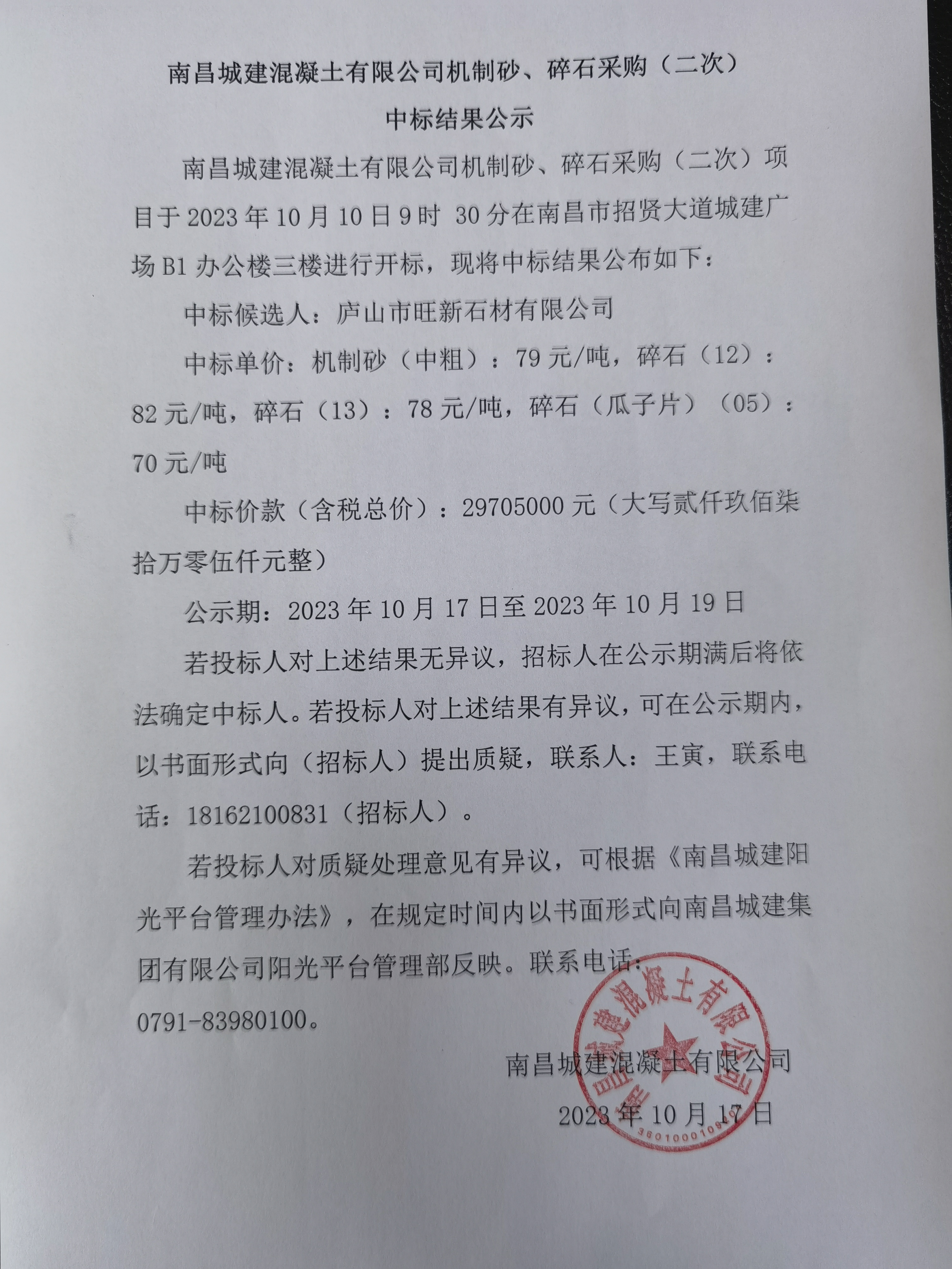 永利yl23411混凝土有限公司机制砂、碎石采购(二次)项目于2023年10月10日9时 30分在南昌市招贤大道城建广场B1办公楼三楼进行开标,现将中标结果公布如下: