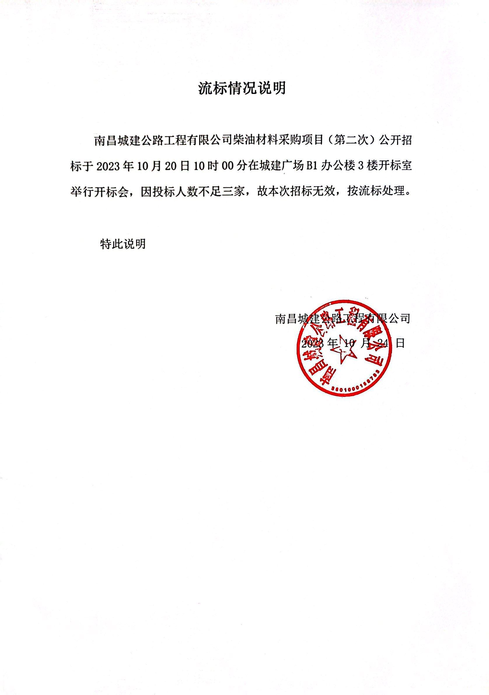 永利yl23411公路工程有限公司柴油材料采购项目(第二次)公开招标于2023年10月20日10时00分在城建广场B1办公楼3楼开标室举行开标会,因投标人数不足三家,故本次招标无效,按流标处理。