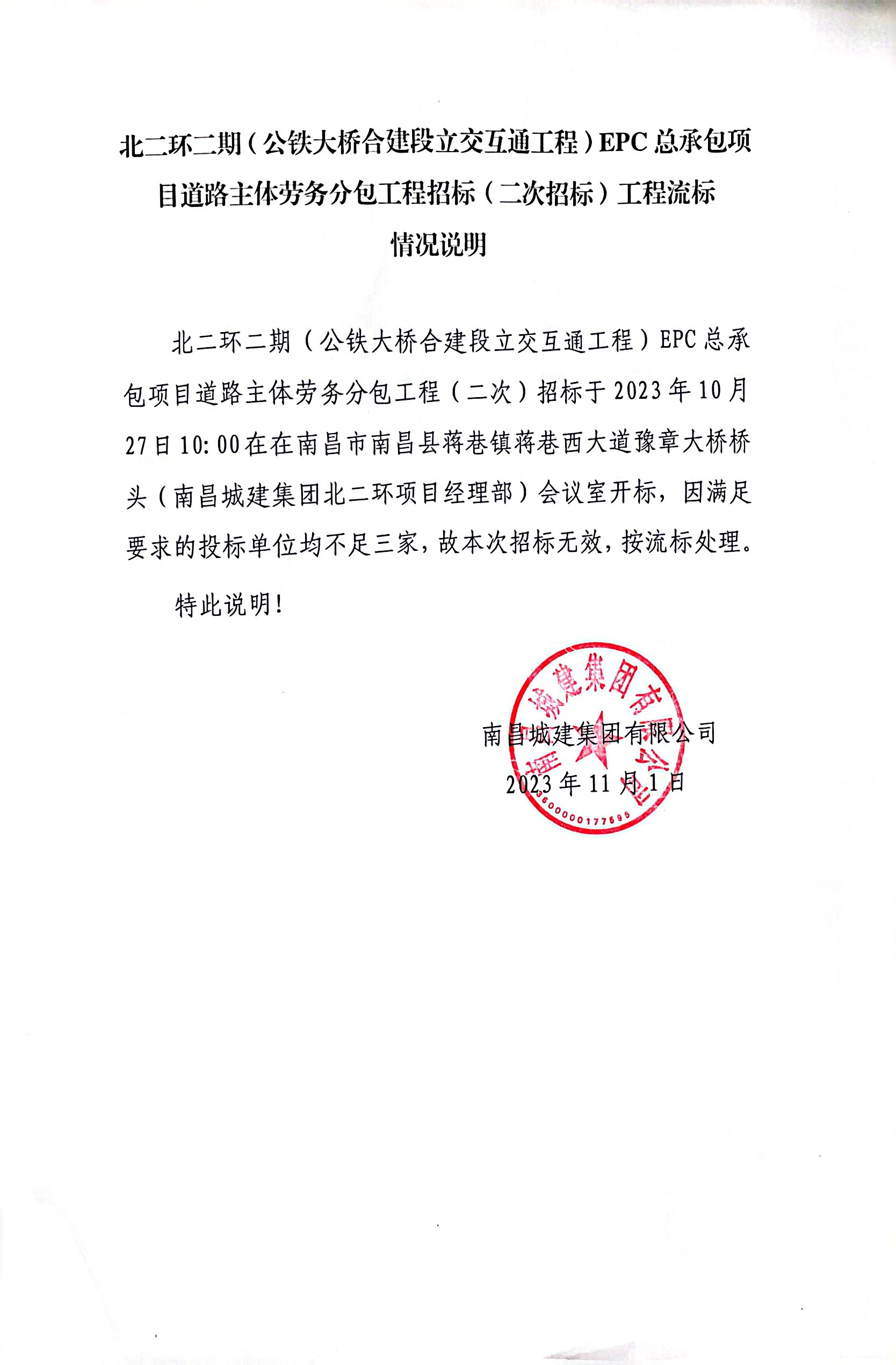 北二环二期(公铁大桥合建段立交互通工程)EPC总承包项目道路主体劳务分包工程(二次)招标于2023年10月27日10:00在在南昌市南昌县蒋巷镇蒋巷西大道豫章大桥桥头(永利yl23411集团北二环项目经理部)会议室开标,因满足要求的投标单位均不足三家,故本次招标无效,按流标处理。