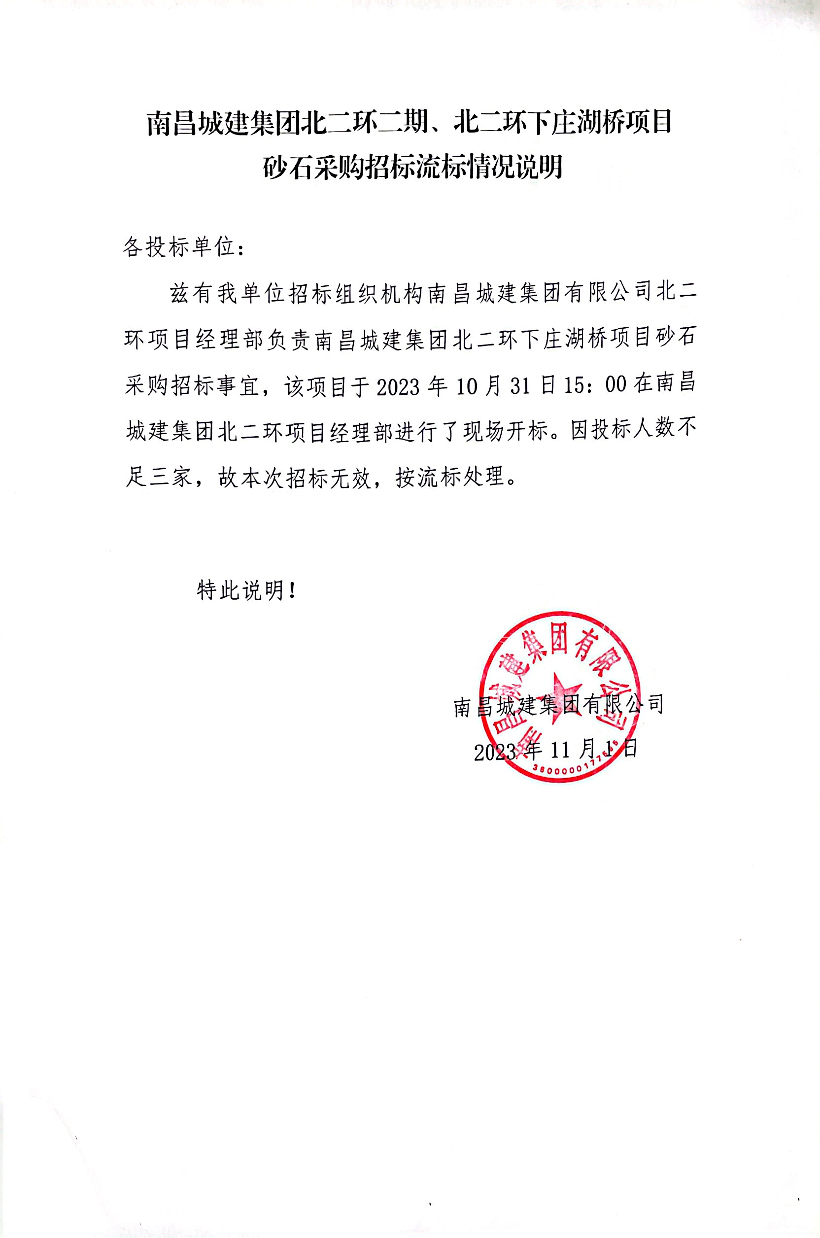 兹有我单位招标组织机构永利yl23411集团有限公司北二环项目经理部负责永利yl23411集团北二环下庄湖桥项目砂石采购招标事宜,该项目于2023年10月31日15:00在永利yl23411集团北二环项目经理部进行了现场开标。因投标人数不足三家,故本次招标无效,按流标处理。