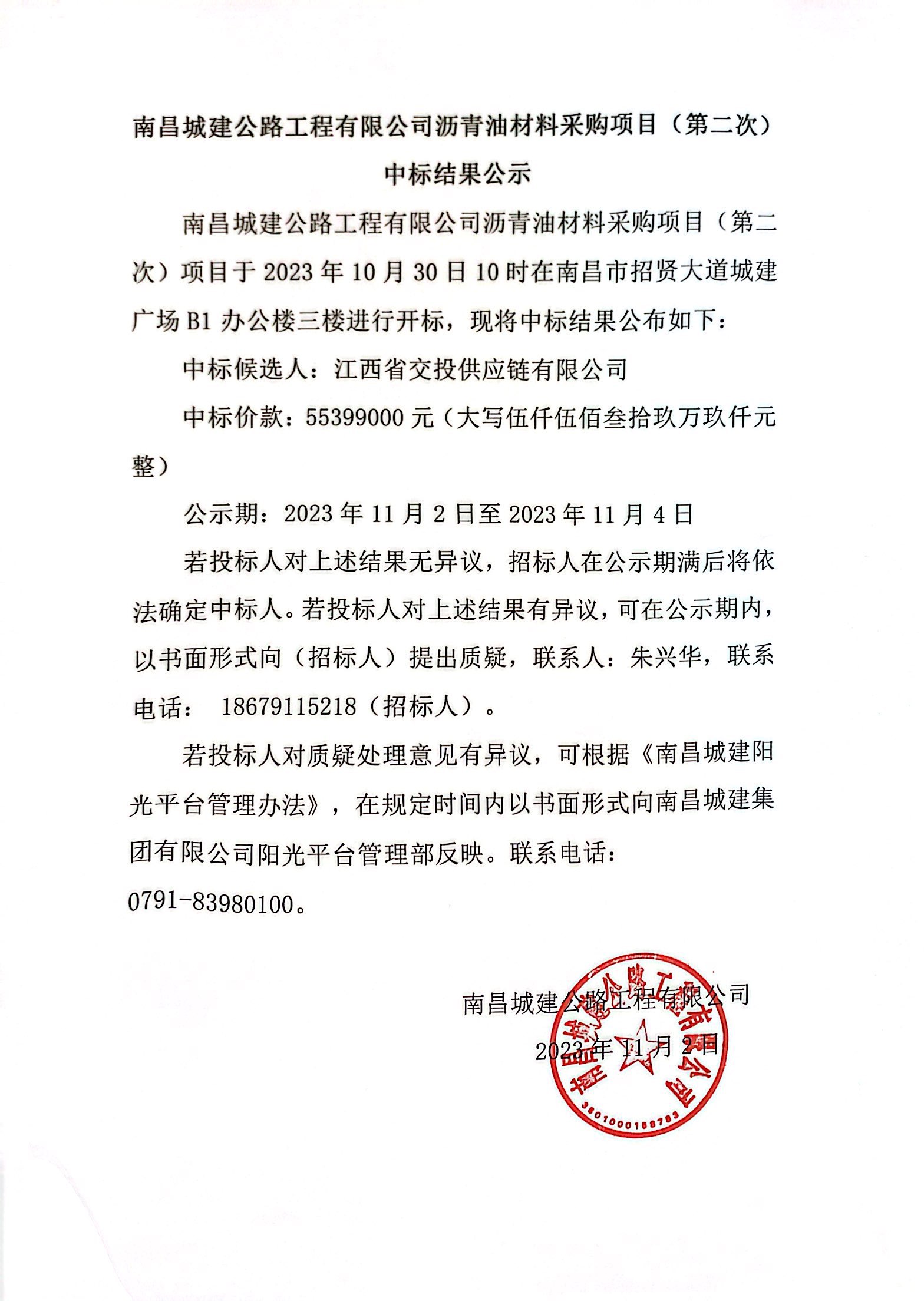 永利yl23411公路工程有限公司沥青油材料采购项目(第二次)项目于2023年10月30日10时在南昌市招贤大道城建广场B1办公楼三楼进行开标,现将中标结果公布如下: