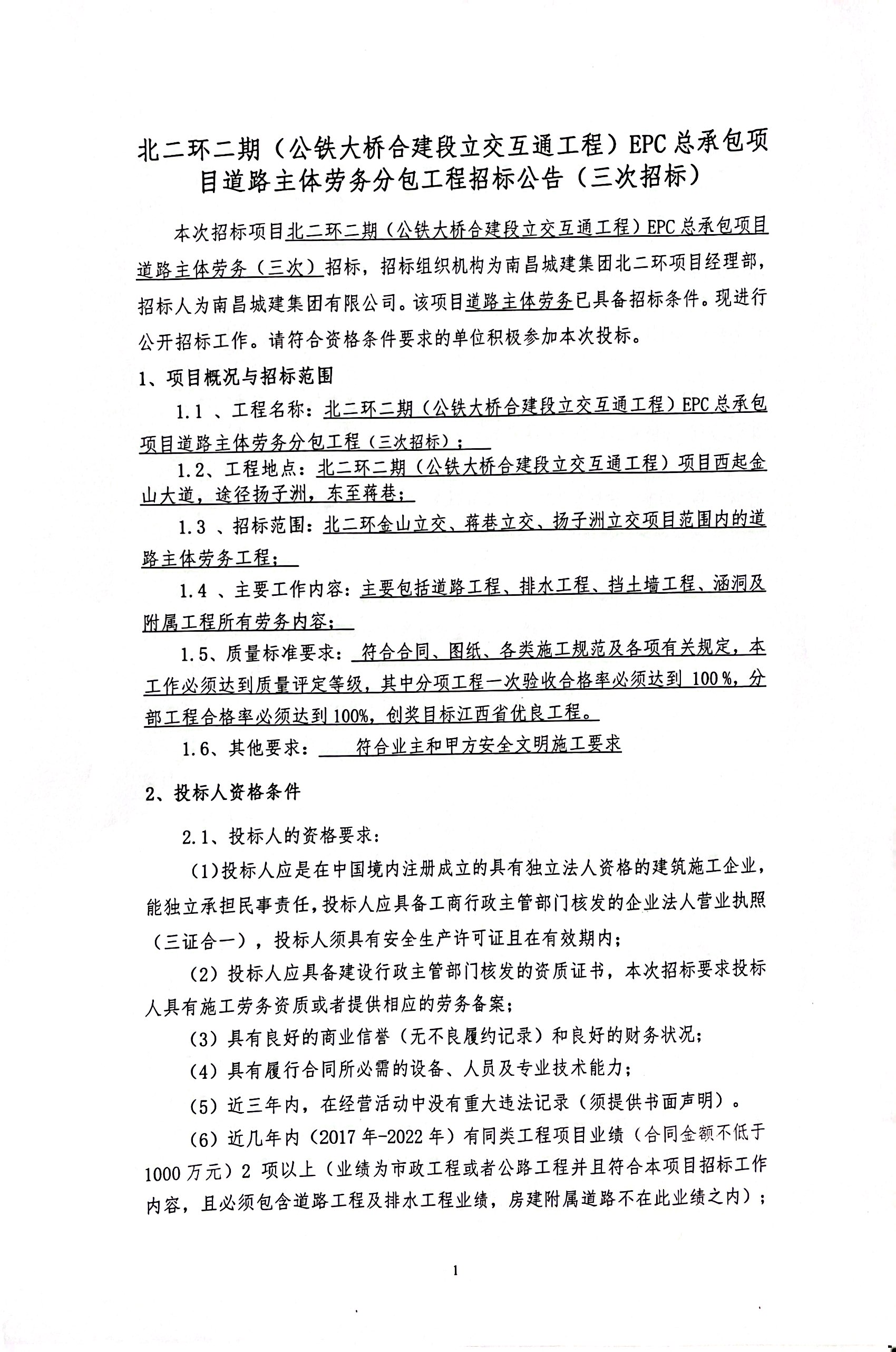 本次招标项目北二环二期(公铁大桥合建段立交互通工程)EPC总承包项目道路主体劳务(三次)招标,招标组织机构为永利yl23411集团北二环项目经理部,招标人为永利yl23411集团有限公司。该项目道路主体劳务已具备招标条件。现进行公开招标工作。请符合资格条件要求的单位积极参加本次投标。