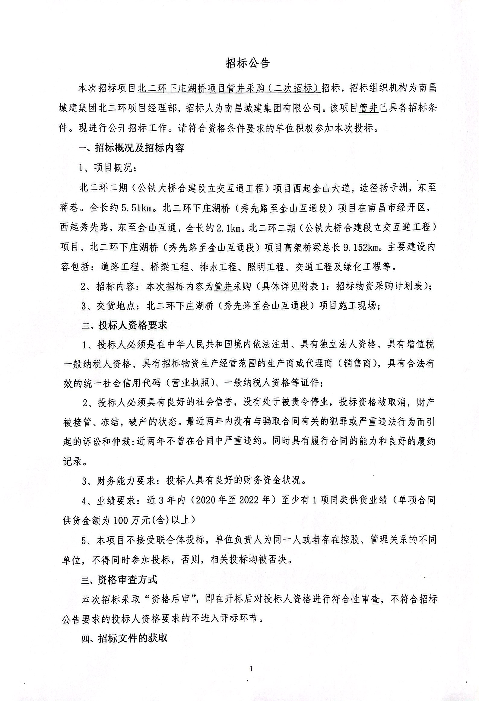 本次招标项目北二环下庄湖桥项目管井采购(二次招标)招标,招标组织机构为永利yl23411集团北二环项目经理部,招标人为永利yl23411集团有限公司。该项目管井已具备招标条件。现进行公开招标工作。请符合资格条件要求的单位积极参加本次投标。