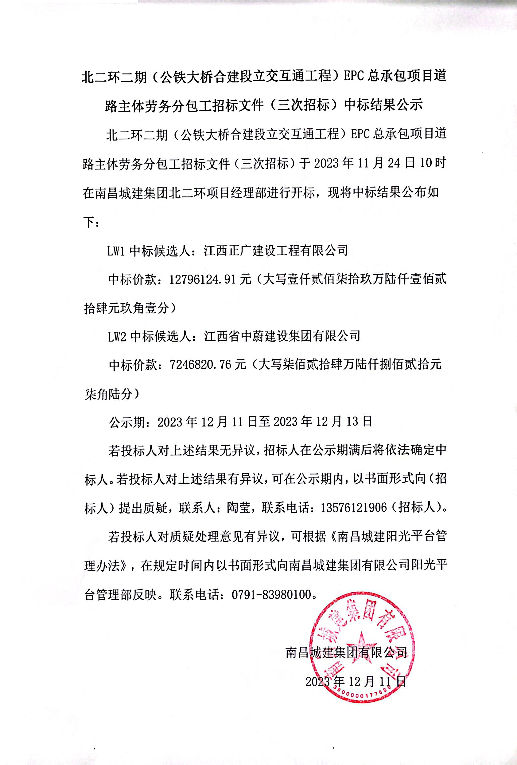 北二环二期(公铁大桥合建段立交互通工程)EPC总承包项目道路主体劳务分包工招标文件(三次招标)于2023年11月24日10时在永利yl23411集团北二环项目经理部进行开标,现将中标结果公布如下: