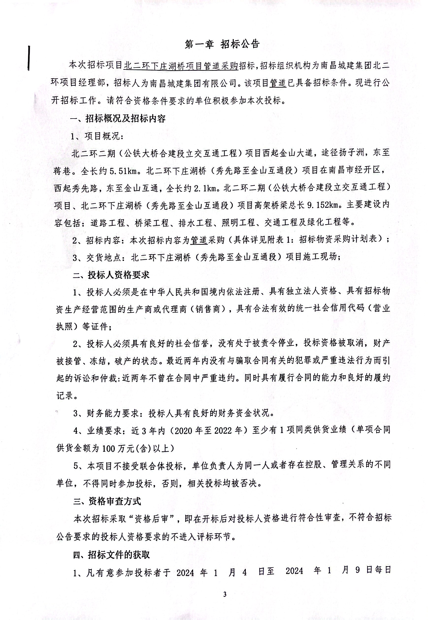 本次招标项目北二环下庄湖桥项目管道采购招标,招标组织机构为永利yl23411集团北二环项目经理部,招标人为永利yl23411集团有限公司。该项目管道已具备招标条件。现进行公开招标工作。请符合资格条件要求的单位积极参加本次投标。
