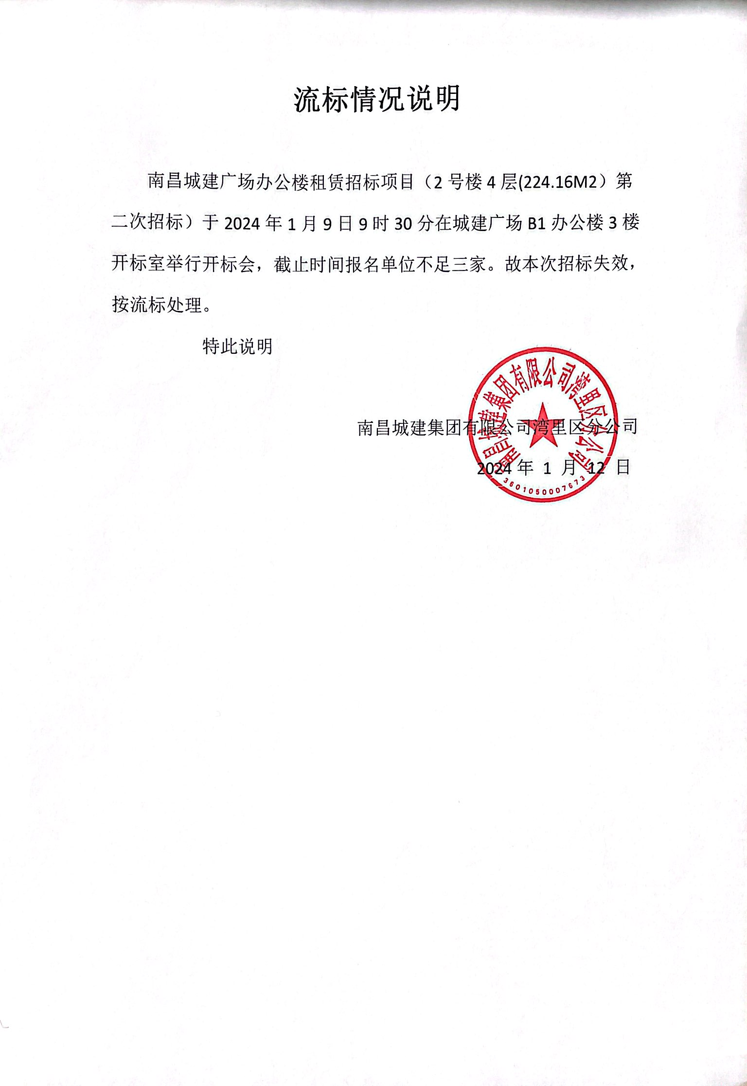 永利yl23411广场办公楼租赁招标项目(2号楼4层(224.16M2)第二次招标)于2024年1月9日9时30分在城建广场B1办公楼3楼开标室举行开标会,截止时间报名单位不足三家。故本次招标失效,按流标处理。